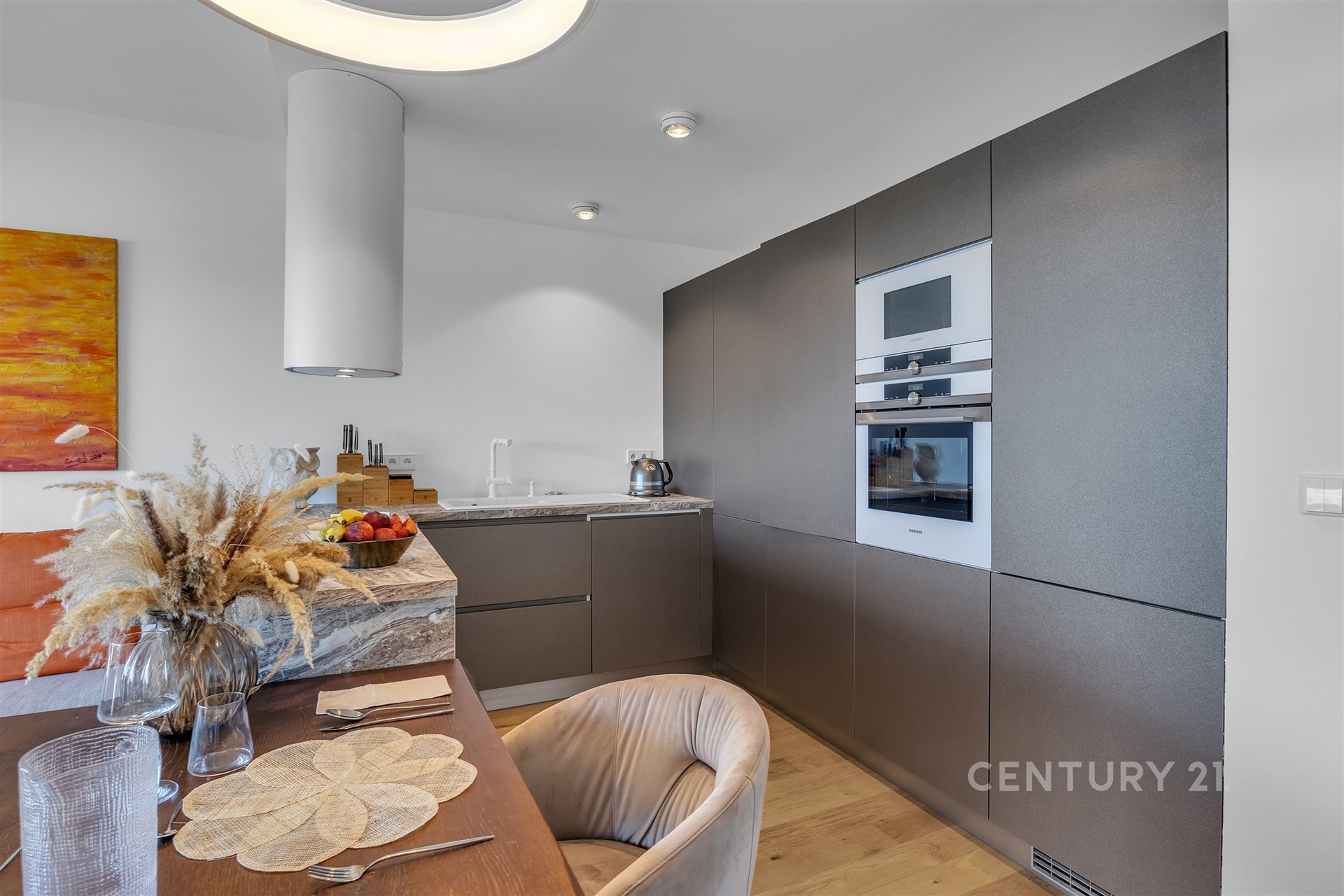 Prostorný obývací pokoj propojený s jídelnou a plně vybavenou moderní kuchyní