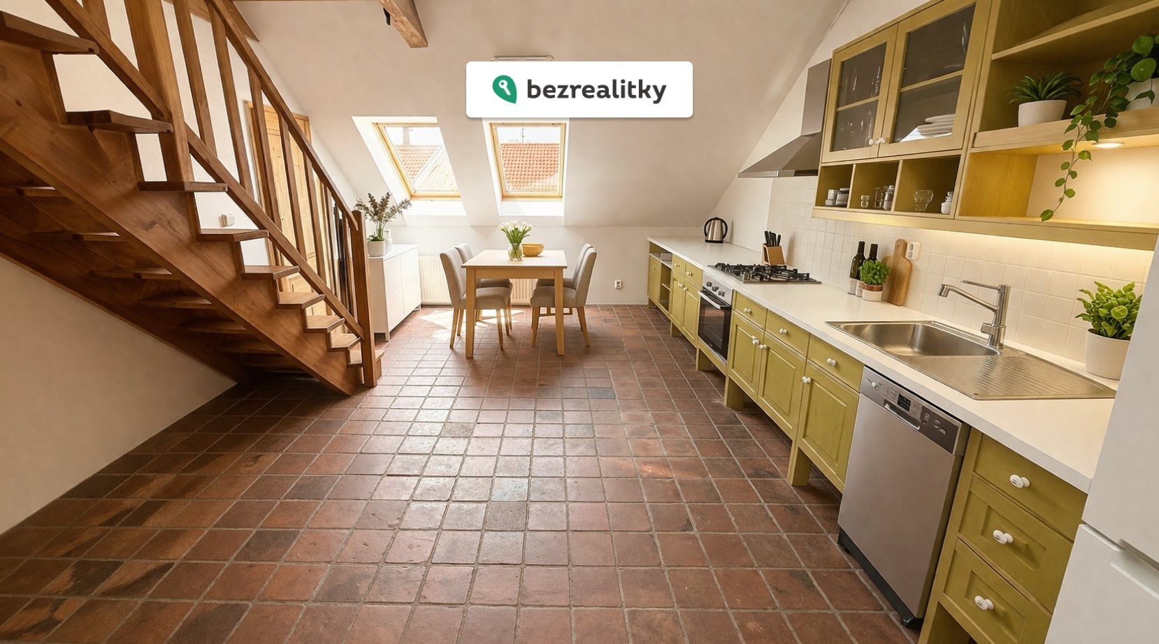 K bytu patří střešní terasa o výměře 14 m², jižně orientovaná, s výhledem přes střechy Nuslí a okolní zeleň — absolutní unikát tohoto bytu. Vstupní chodbou s hexagonální dlažbou vejdete do hlavního obytného prostoru s kuchyňským koutem. Dřevěné trámy, střešní okna, dřevěné schodiště vedoucí do horního patra a světlá výška stropu až 4,5 metru dodávají prostoru jedinečný podkrovní charakter. Na obytný prostor navazuje ložnice s vestavěnou šatnou. Koupelna s vanou i sprchovým koutem a samostatné WC doplňují dispozici. Z obývacího pokoje vede dřevěné schodiště do horní úrovně — podkrovního pokoje s prosklenými francouzskými dveřmi, které vedou přímo na terasu. V horním patře se nacházejí také dodatečné úložné prostory. Součástí je sklep v suterénu domu (8 m²). Byt prošel částečnou rekonstrukcí v roce 2017.