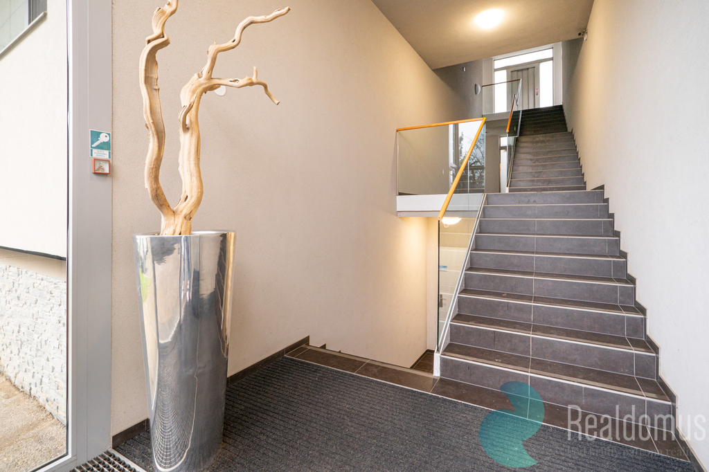 Dům je moderní skeletová stavba zkolaudovaná v roce 2013, kompletně zateplená, bezbariérová a architektonicky oceňovaná. Vytápění a ohřev vody jsou řešeny centrálně s vlastní výměníkovou stanicí v domě. Samozřejmostí jsou kvalitní materiály – zděné jádro, hliníková okna s dvojskly, dřevěné plovoucí podlahy.