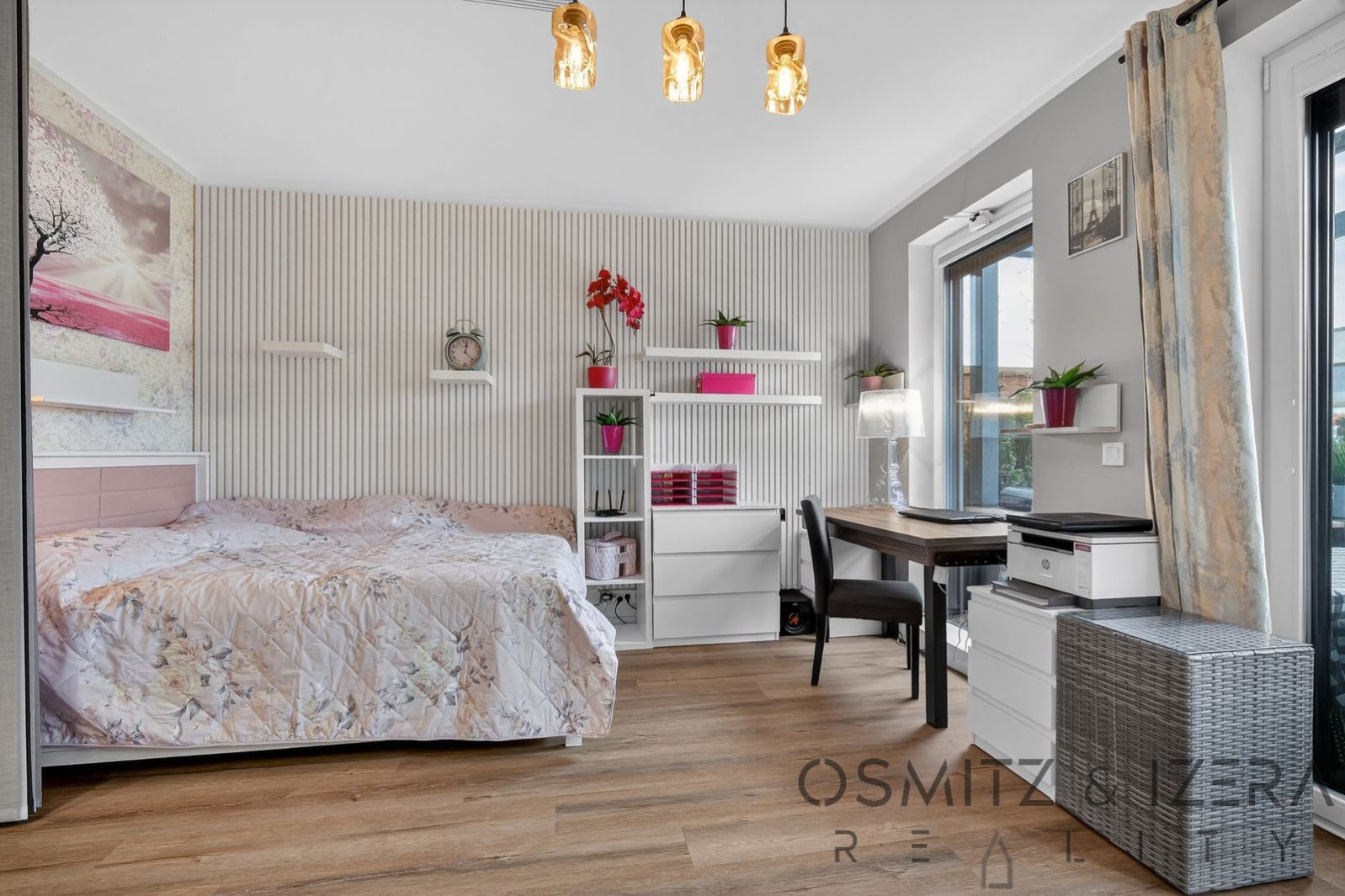 Byt v moderním designu lze snadno příčkou upravit na 2kk. Aktuálně jej tvoří prostorný obývací pokoj s kuchyní, ložnice oddělená japonskými stěnami a menší pracovna.