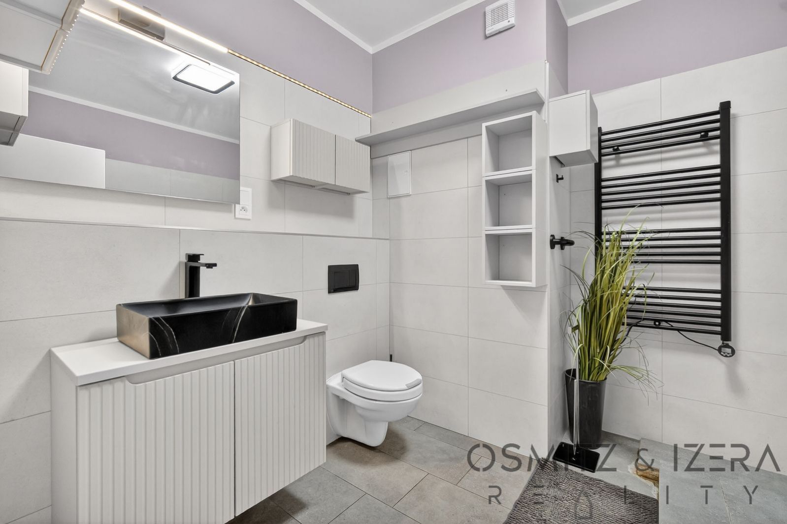 Koupelna: Vana, závěsné WC, černé keramické umyvadlo, pračka se sušičkou a topný žebřík.