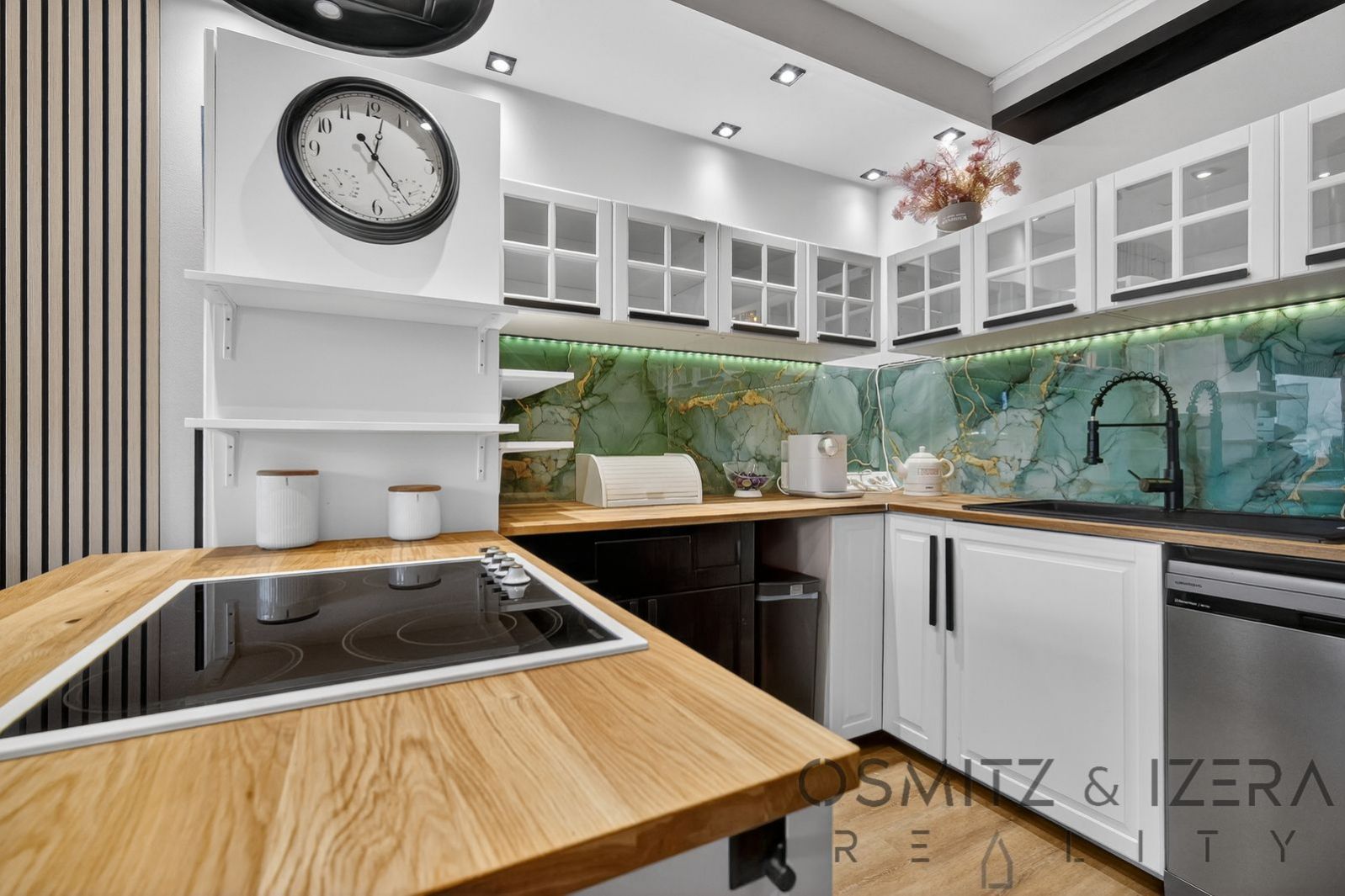 Kuchyně: Tvar U, ostrůvek se sklokeramickou deskou, vestavěné spotřebiče (americká lednice, horkovzdušná trouba, myčka, digestoř, dřez Franke), skleněné obklady a snížený strop s bodovými světly.