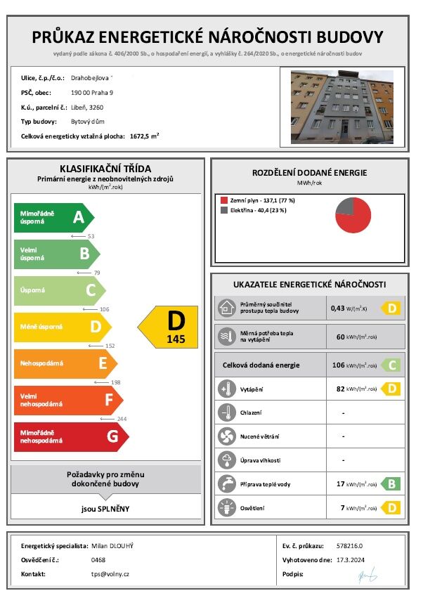 - Energetická náročnost budovy: D - Méně úsporná