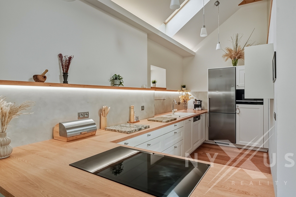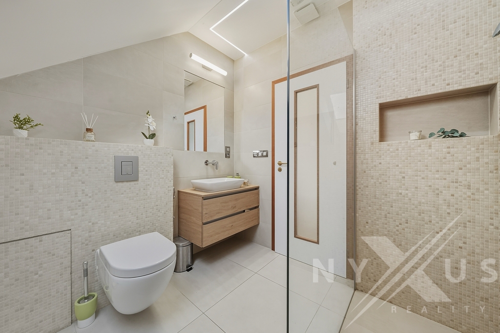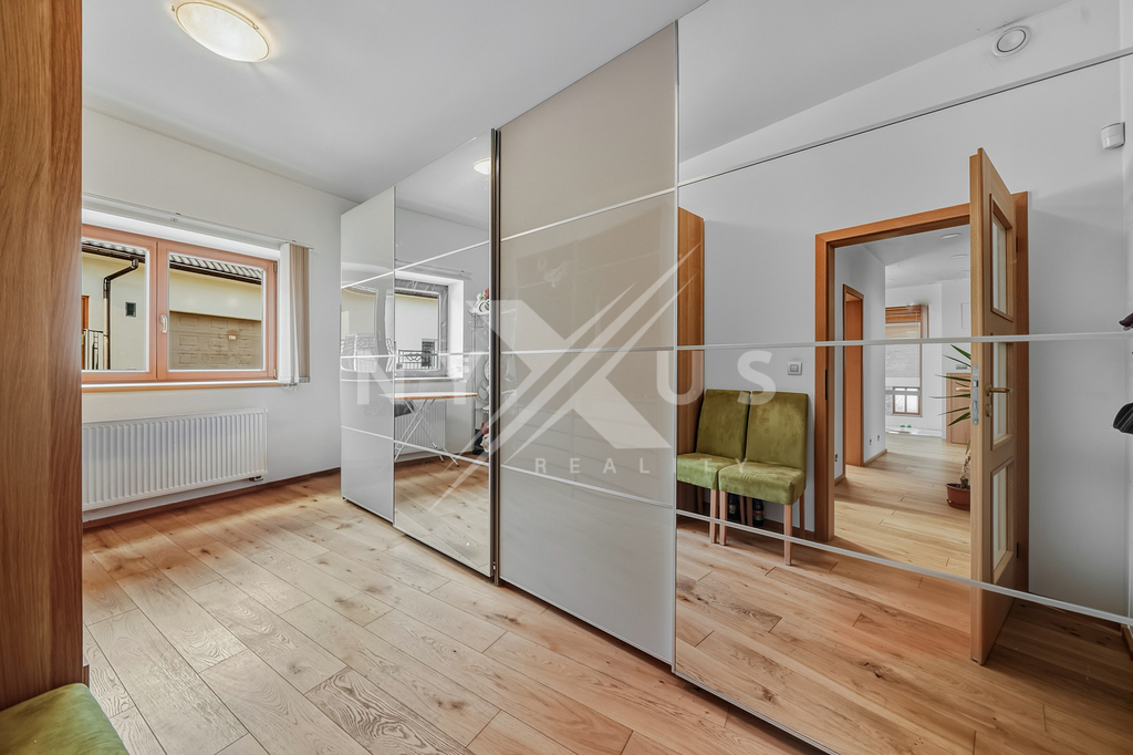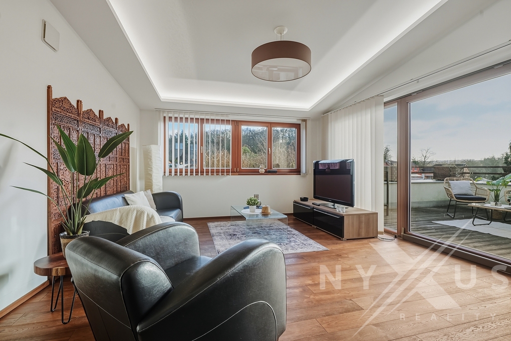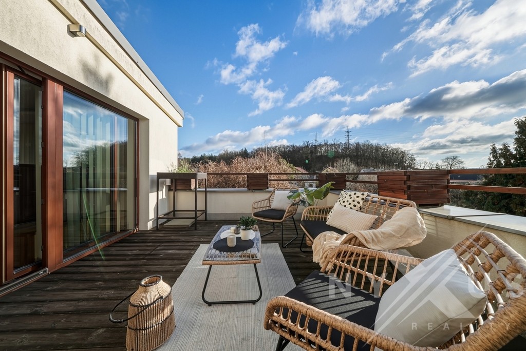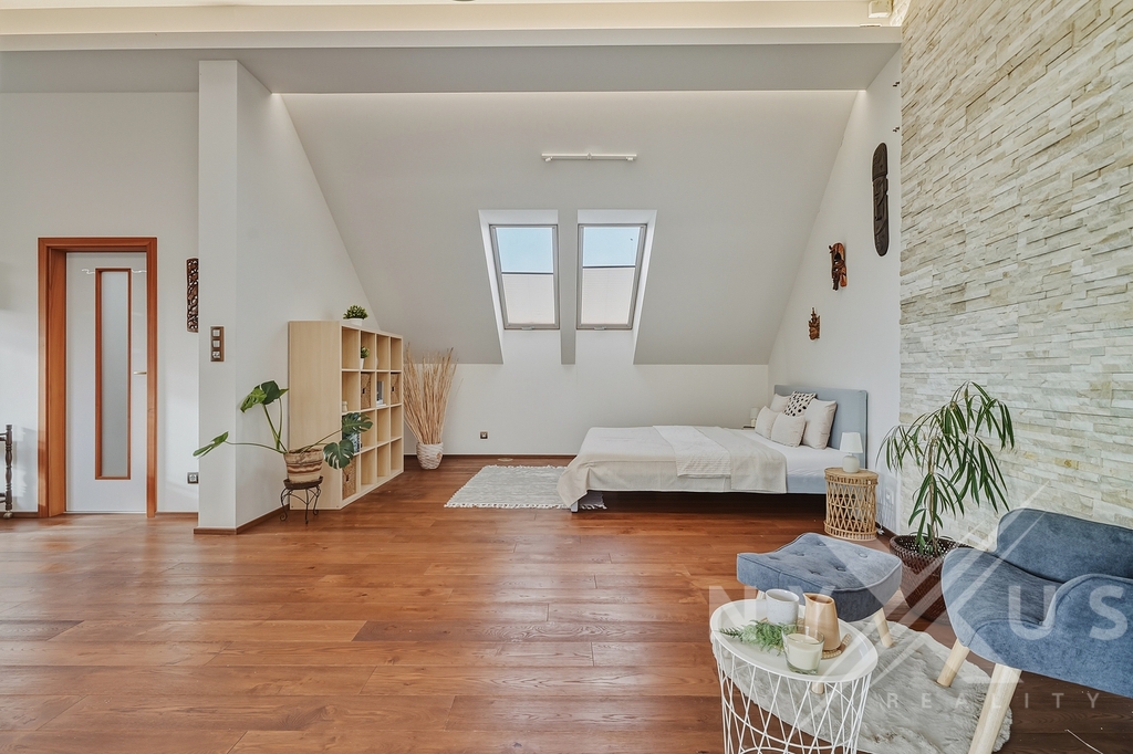 Horní patro funguje téměř jako samostatná jednotka, nicméně se vchodem skrze hlavní část. Aktuálně je řešeno jako prostorné 1+kk s vlastní kuchyní, koupelnou a terasou s výhledem do zahrady, přičemž prostor lze snadno rozdělit na 2+kk. Výhodou je také, že terasa má přívod vody, připravenou elektřinu pro pergolu a nosnost pro vířivku.