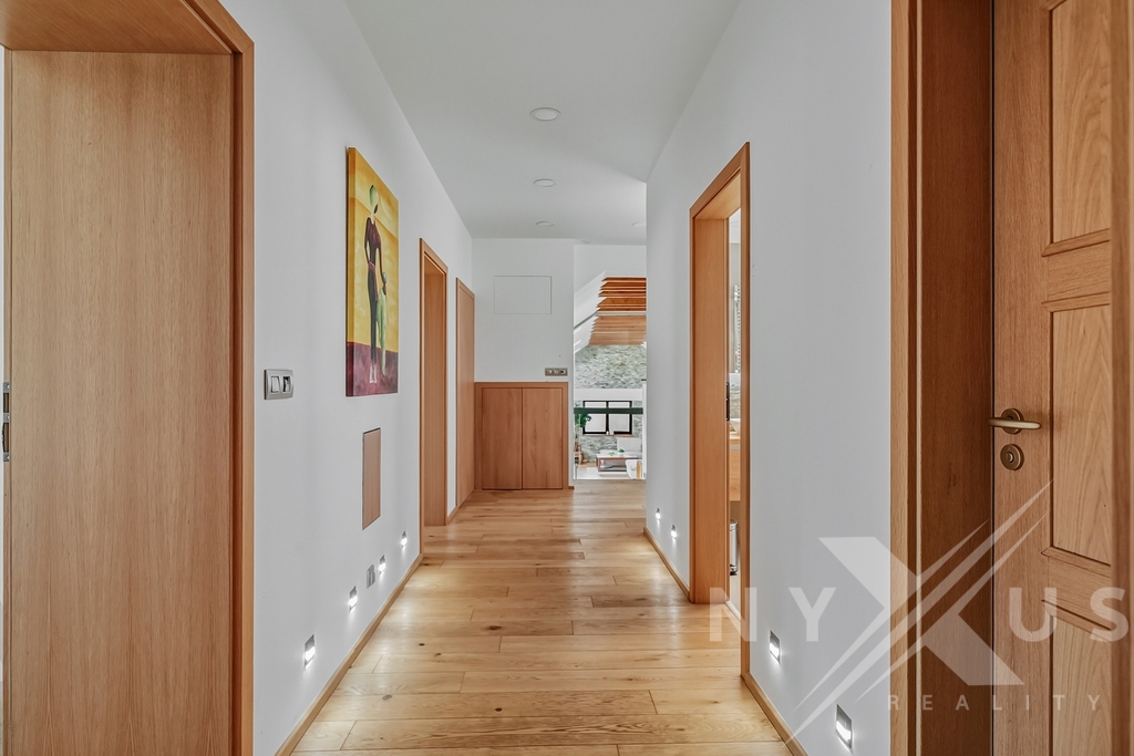 Interiér je postaven na kvalitních materiálech – třívrstvé dubové podlahy s anhydritovým podkladem a teplovodním podlahovým topením, v menších místnostech doplněné o radiátory. Osvětlení je řešeno LED rampami na míru s důrazem na přirozený světelný komfort s možností tlumení a změny barev.