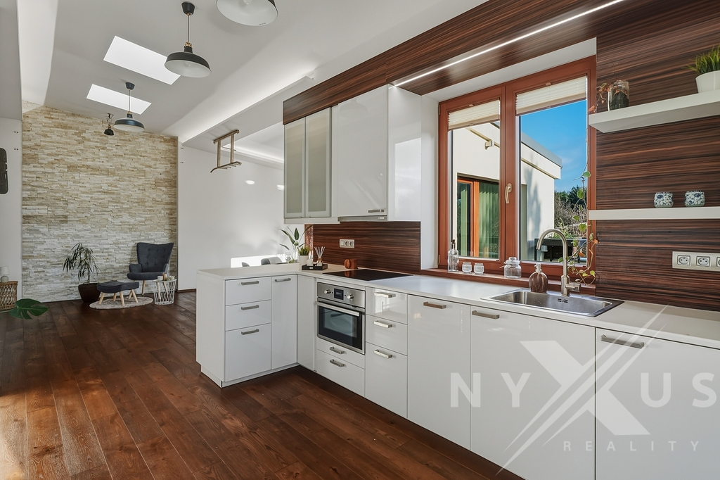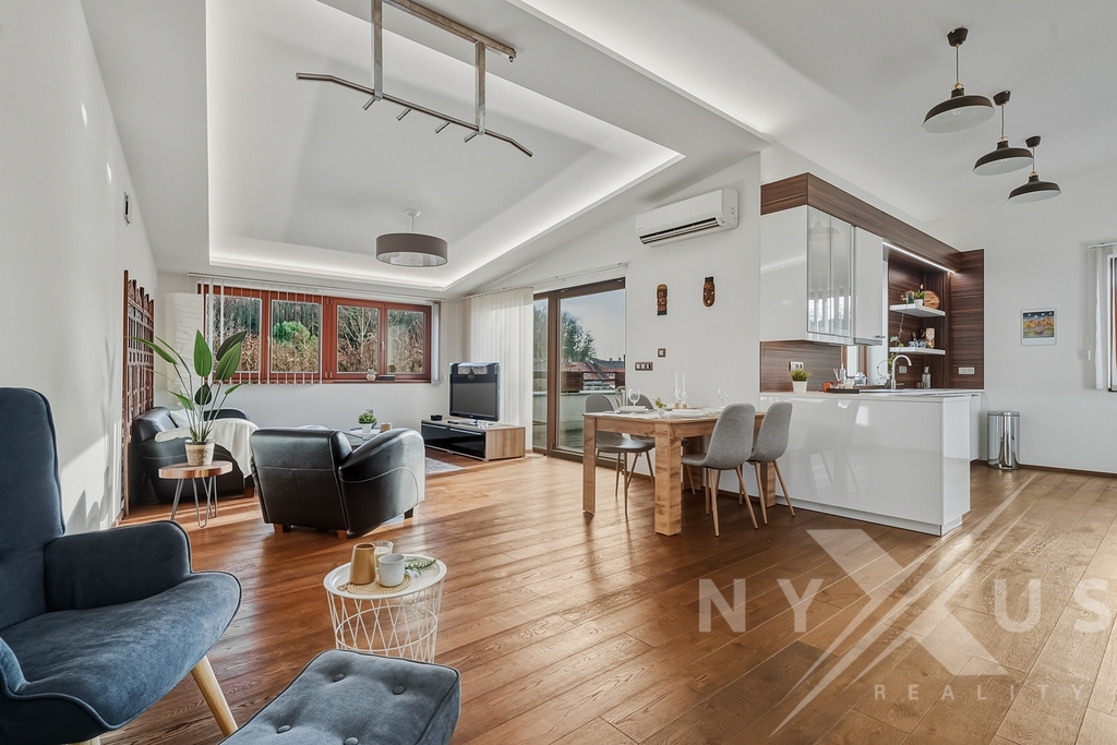 Hlavním obytným prostorem je otevřený obývací pokoj propojený s kuchyní a jídelní částí o celkové ploše 58,45 m². Od zbývající obytné části je oddělen skleněnou stěnou a velká dřevěná okna s protihlukovými trojskly přivádějí do interiéru dostatek denního světla a zároveň zachovávají klid s příjemným výhledem do zahrady.