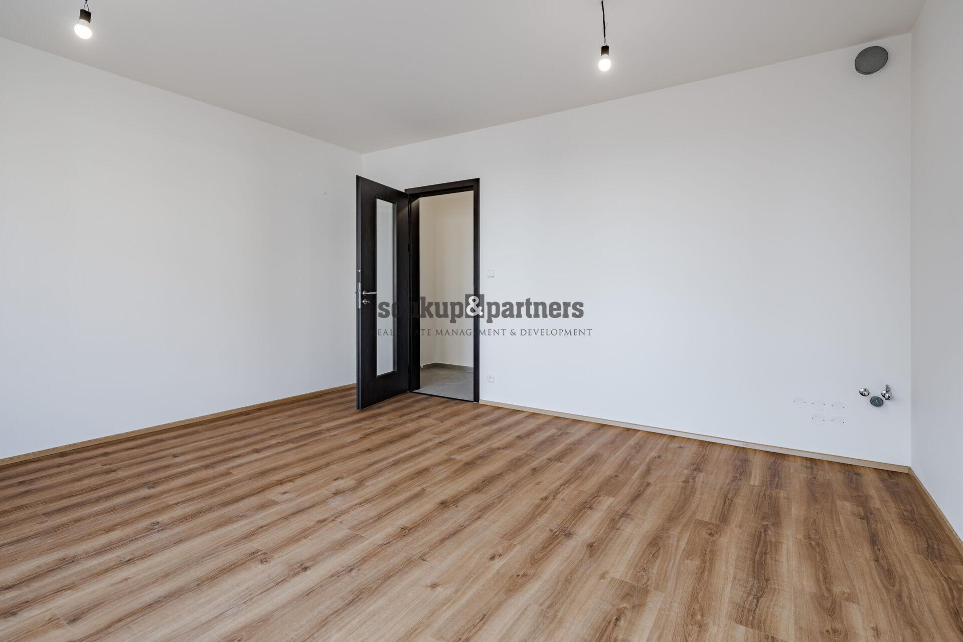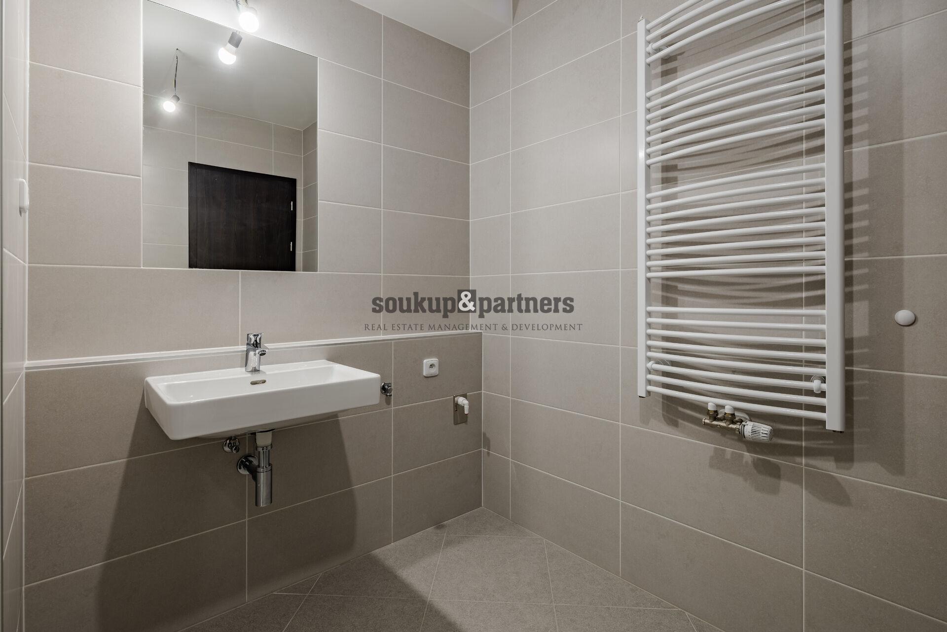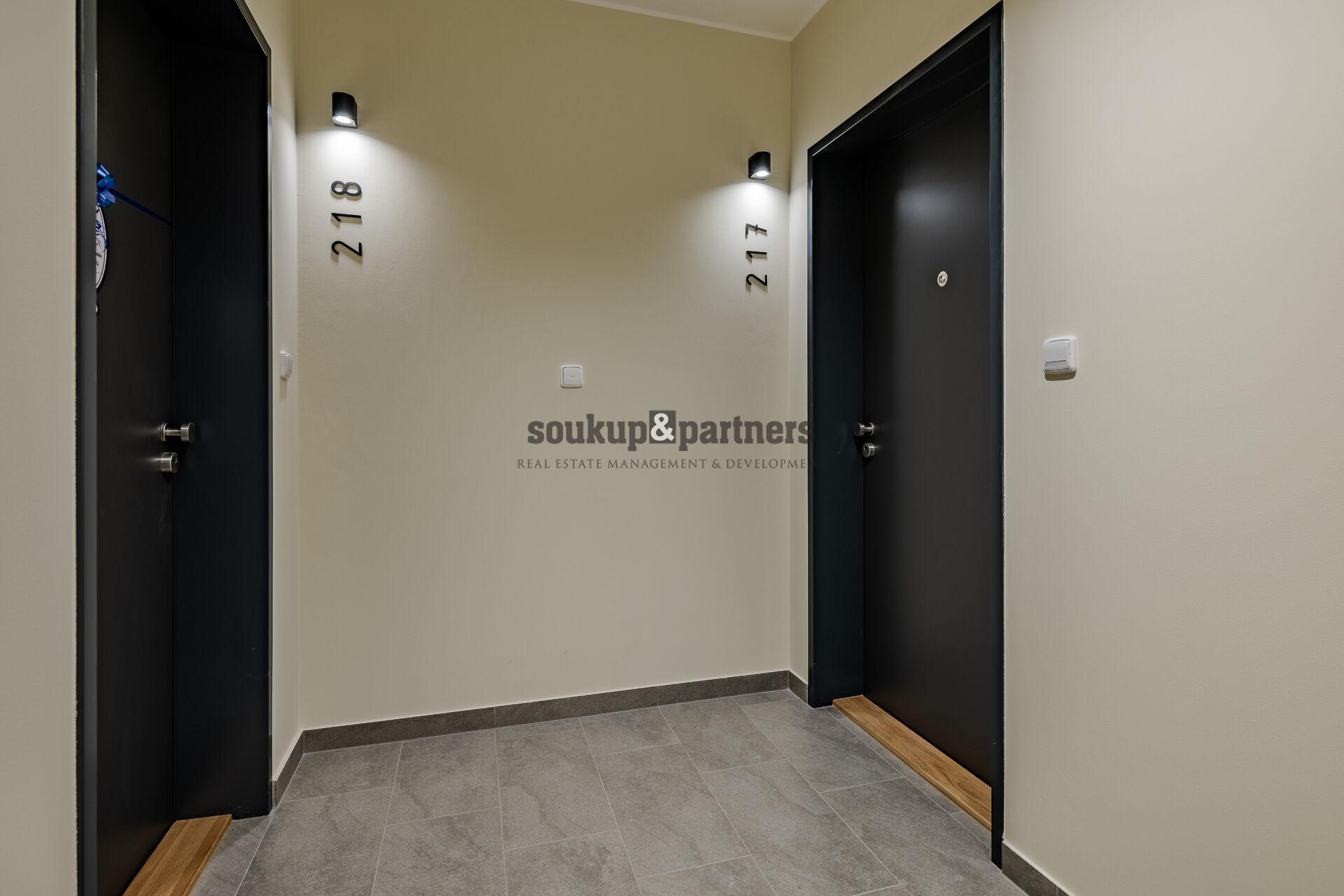 Byt je nabízen ve standardu developera, který zahrnuje koupelnu se sprchovým koutem, interiérové dveře včetně obložek značky Sapelli a kompletní přípravu na kuchyňskou linku i pračku. V obytné části je položena vinylová podlaha v dekoru dřeva, zatímco koupelna a chodba je řešena keramickou dlažbou.