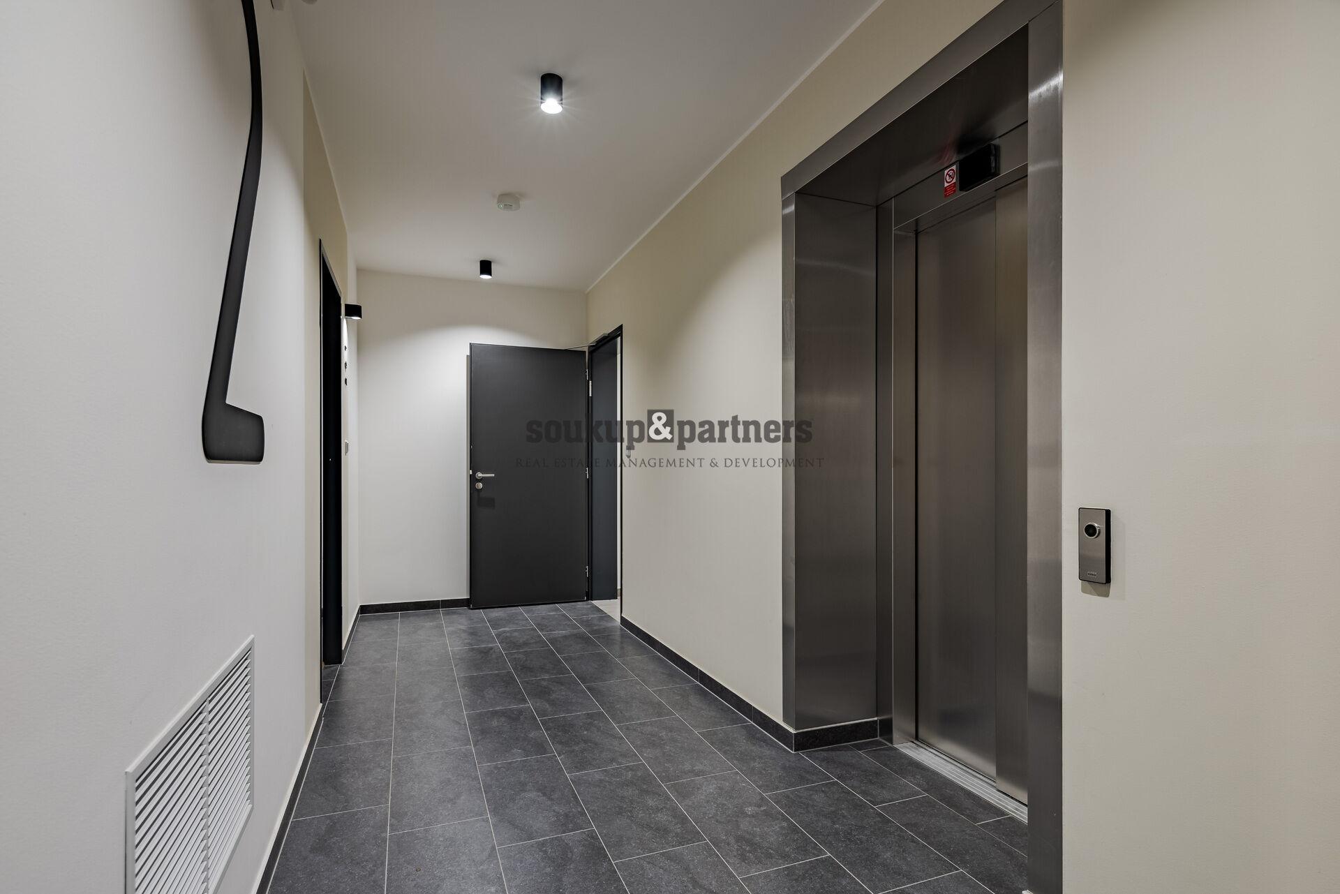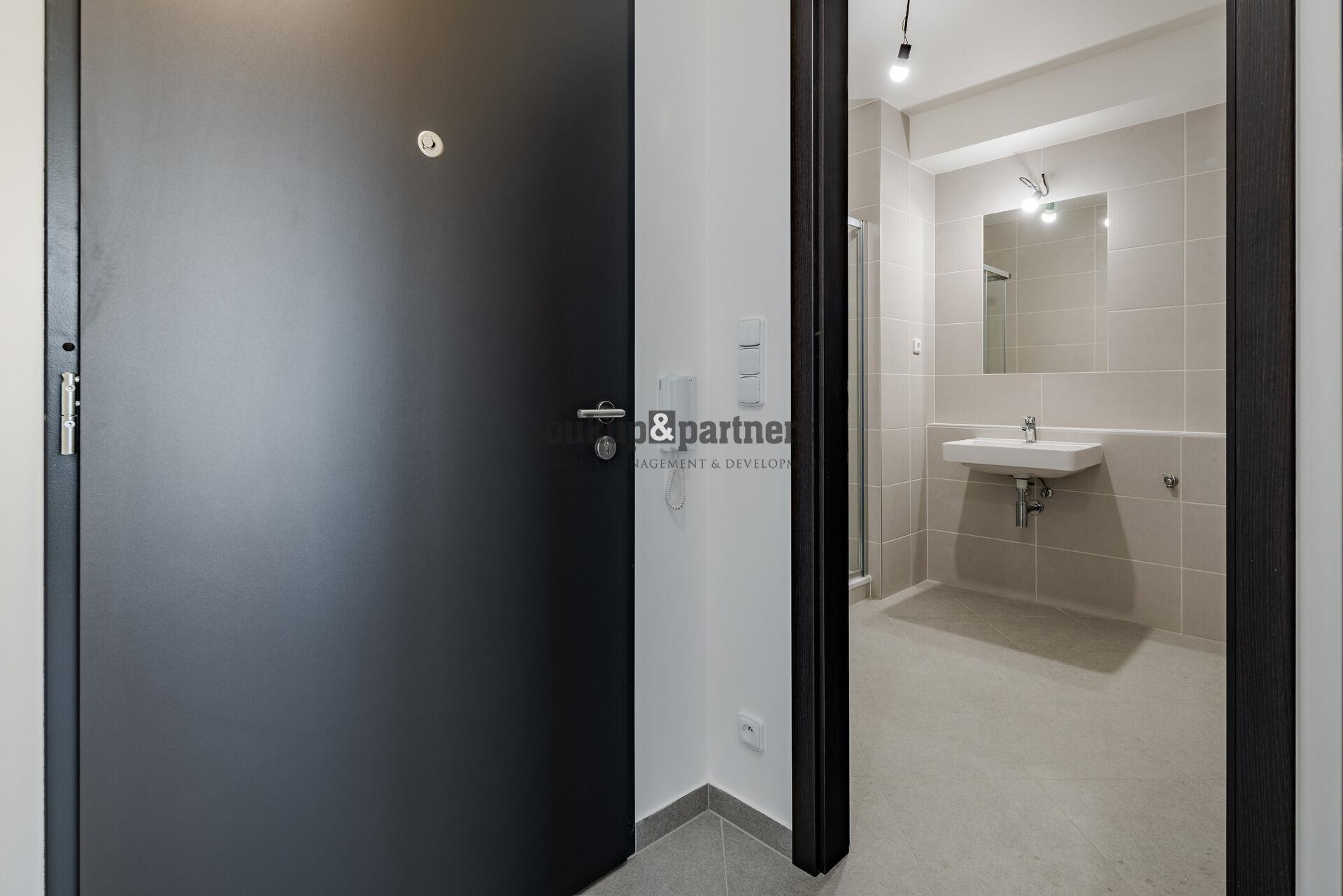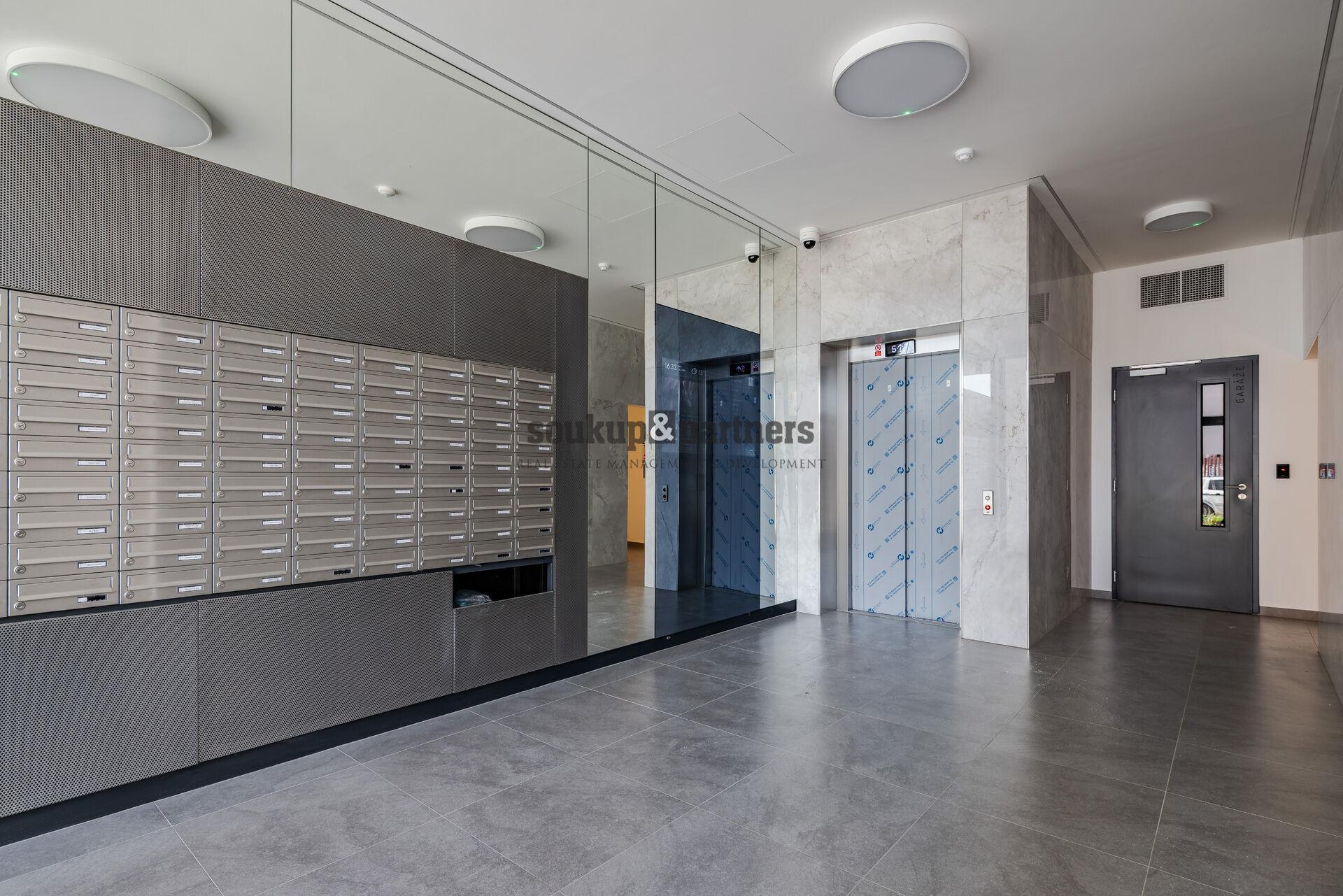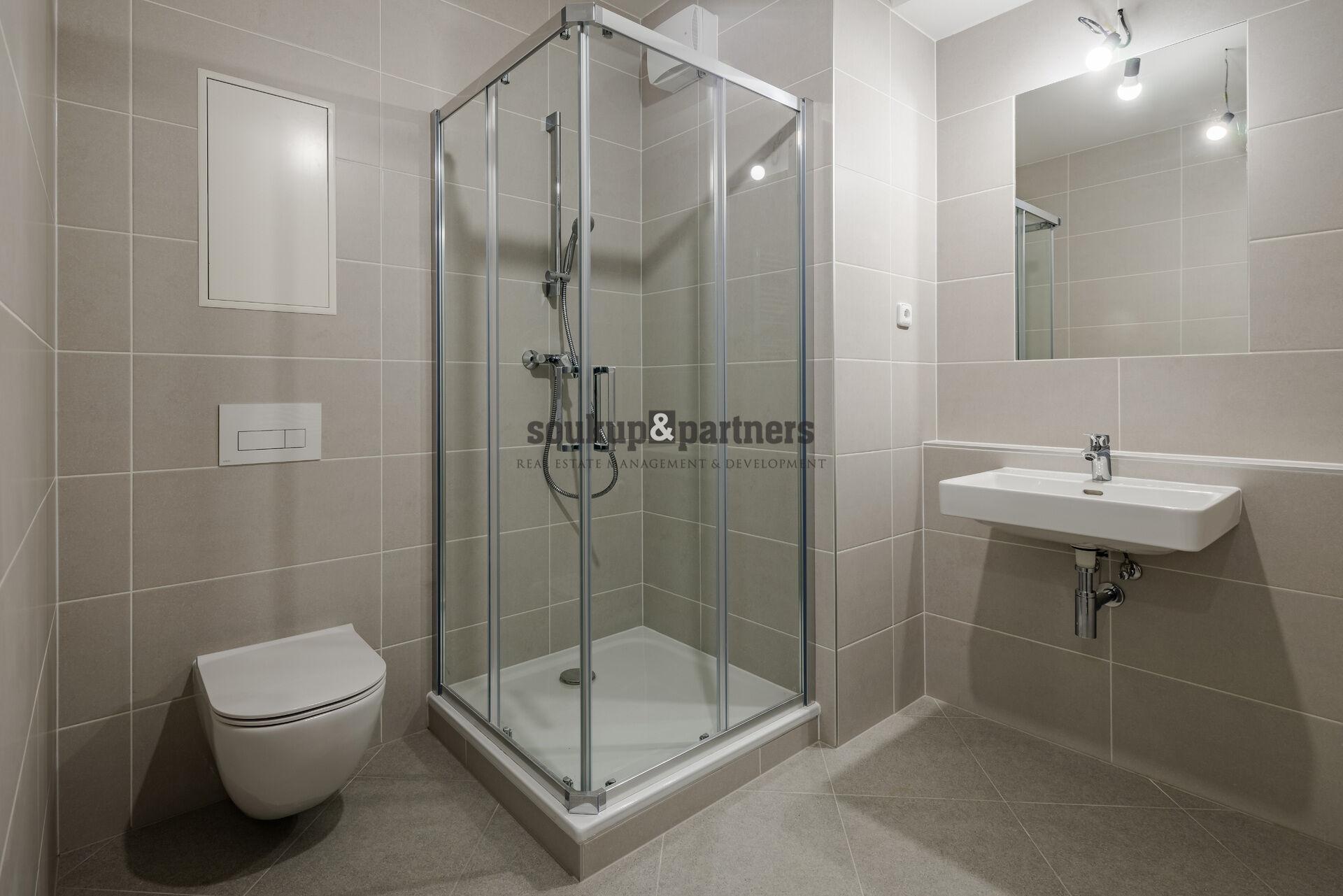 Byt je nabízen ve standardu developera, který zahrnuje koupelnu se sprchovým koutem, interiérové dveře včetně obložek značky Sapelli a kompletní přípravu na kuchyňskou linku i pračku. V obytné části je položena vinylová podlaha v dekoru dřeva, zatímco koupelna a chodba je řešena keramickou dlažbou.