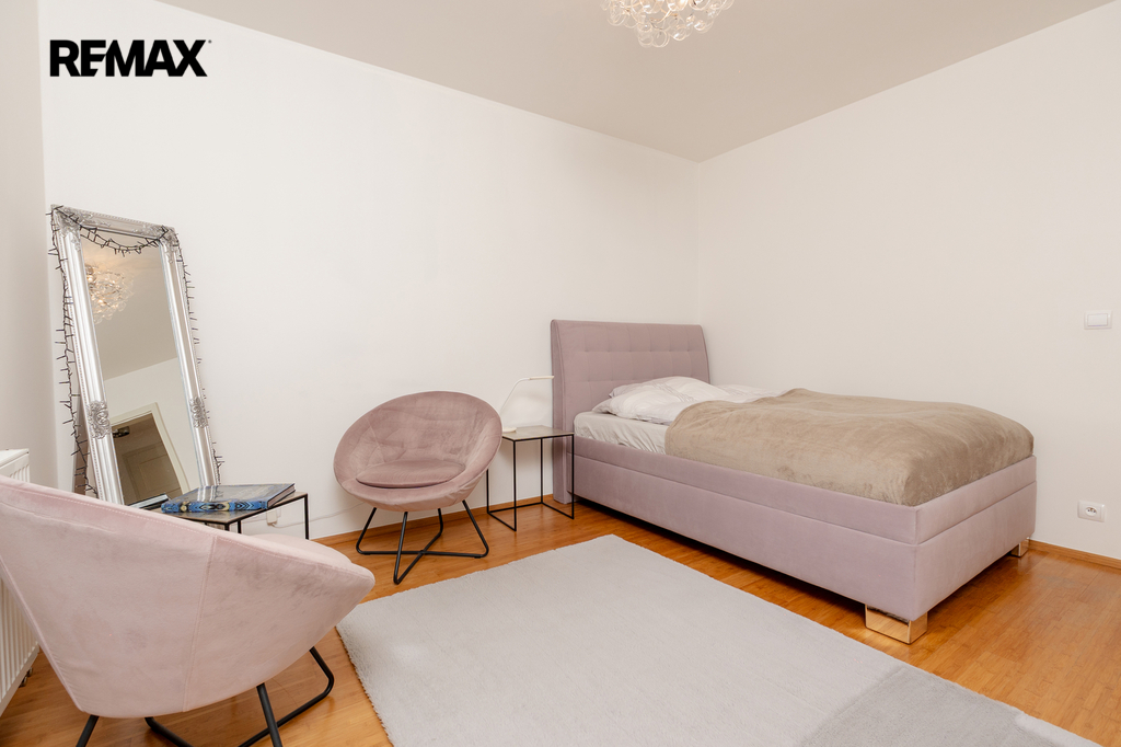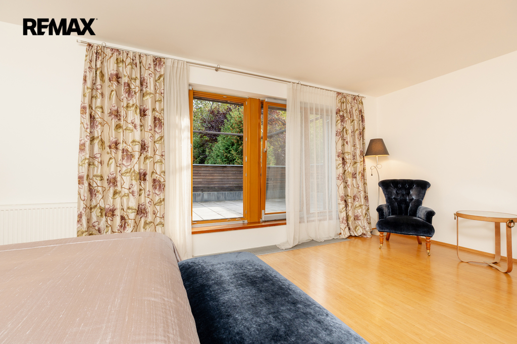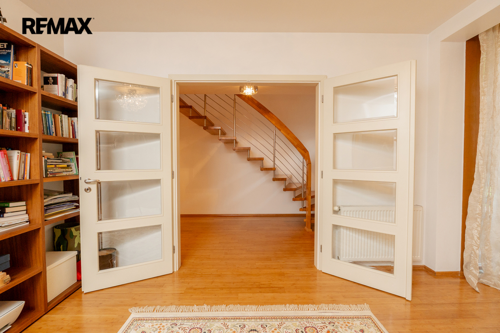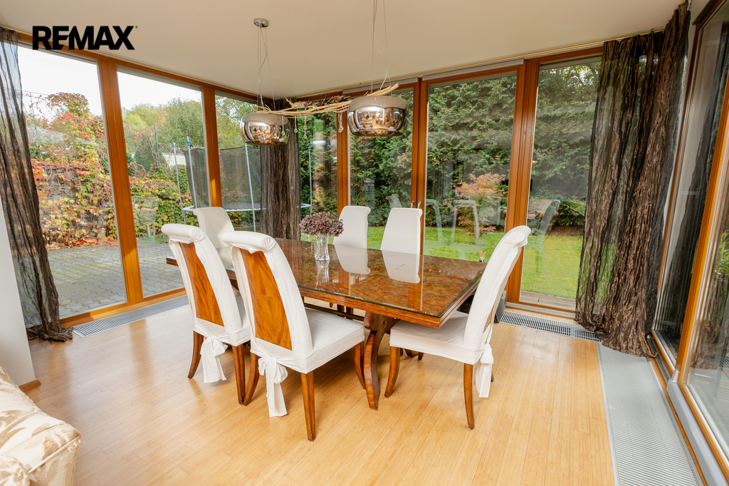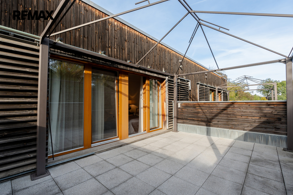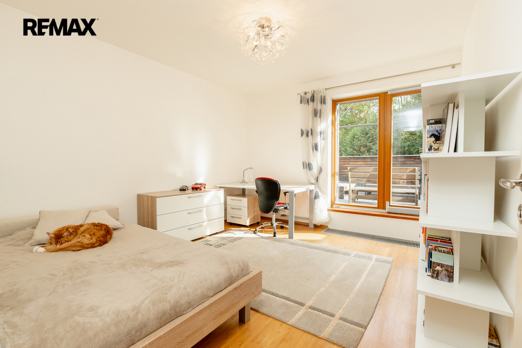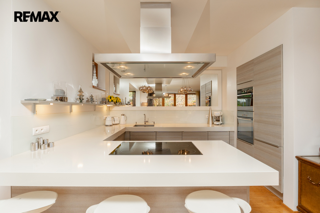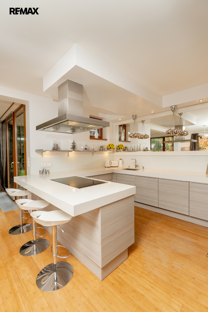 Součástí obytné části je designová kuchyň značky Poggenpohl, vybavená veškerými vestavěnými spotřebiči. Velká francouzská okna zajišťují dostatek denního světla a dodávají interiéru vzdušnost a eleganci.