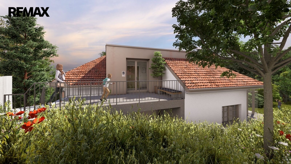 - V přízemí se nachází byt 4+kk o velikosti 129 m² se zahradou, terasou 109 m² a parkováním.