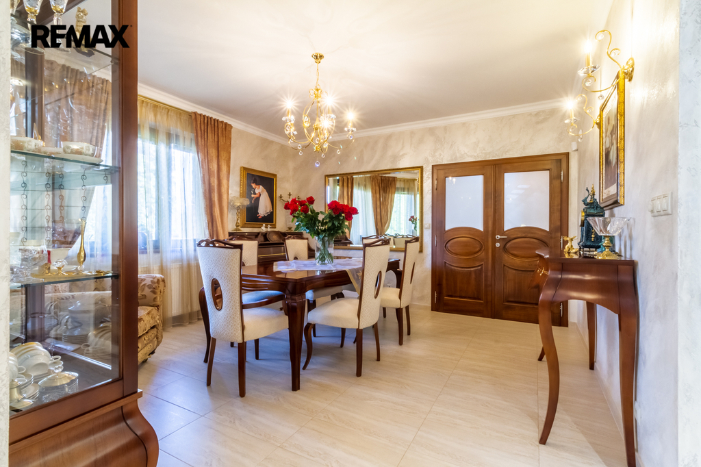 Interiér domu nabízí podlahovou plochu 340 m², kterou doplňuje dalších 81 m² exteriérových prostor – zimní zahrada, zahradní sklad, dvougaráž a balkon.