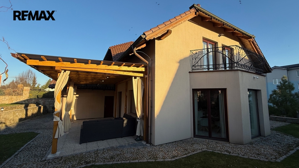Pergola, přístupná jak z obývacího pokoje, tak ze sauny, vytváří ideální prostor pro relaxaci i společenská setkání v soukromí vlastní zahrady.