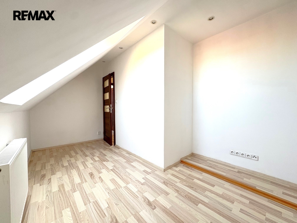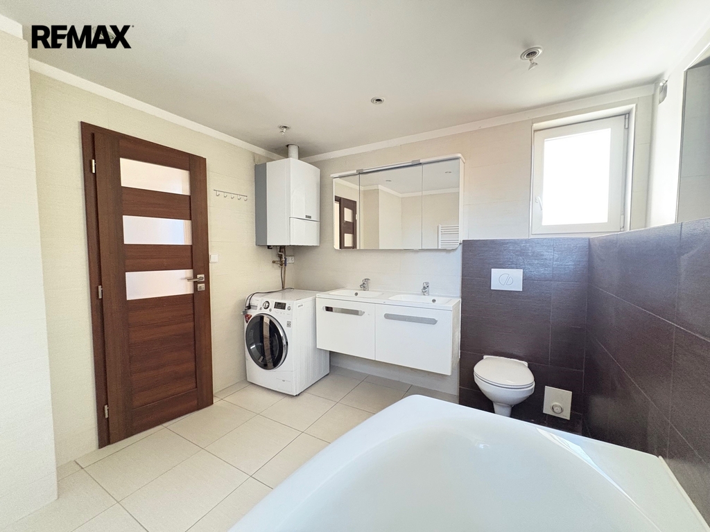 V patře se nachází tři samostatné pokoje a druhá velká koupelna s vanou, 2 umyvadly a WC.