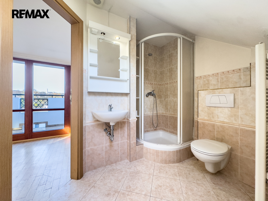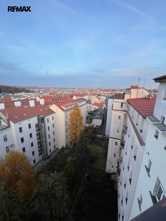 Hlavním lákadlem bytu je však prostorná střešní terasa o velikosti 18m2, která je umístěna do vnitrobloku a nabízí výjimečný a nerušený výhled na celou Prahu. Výhledově bude společenství vlastníků jednat o instalaci výtahu.