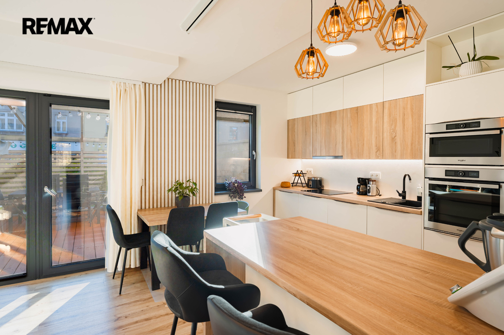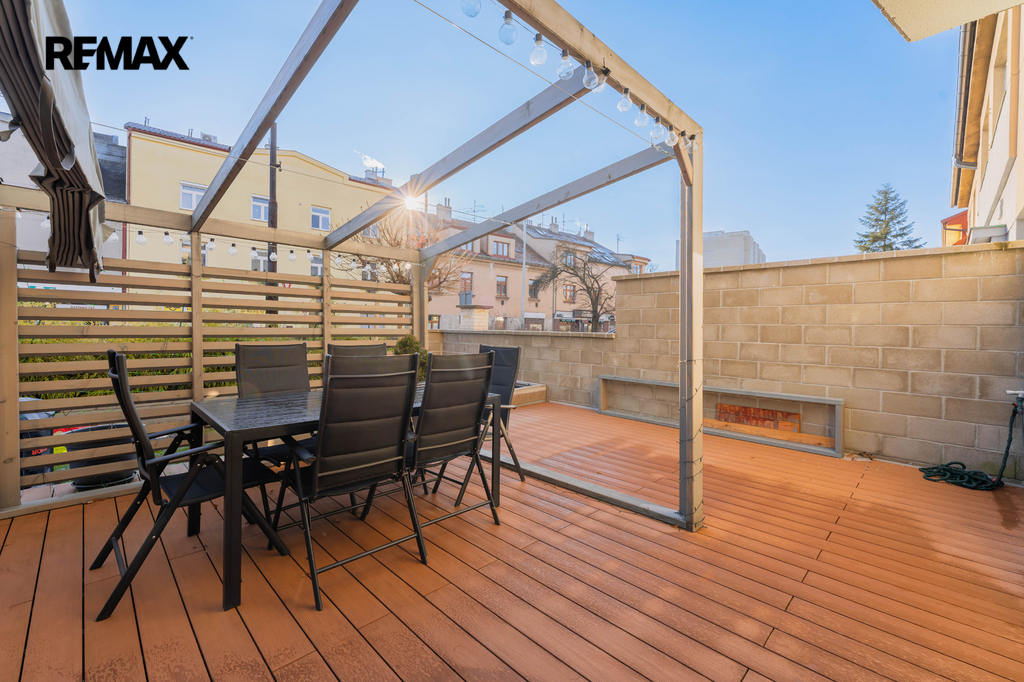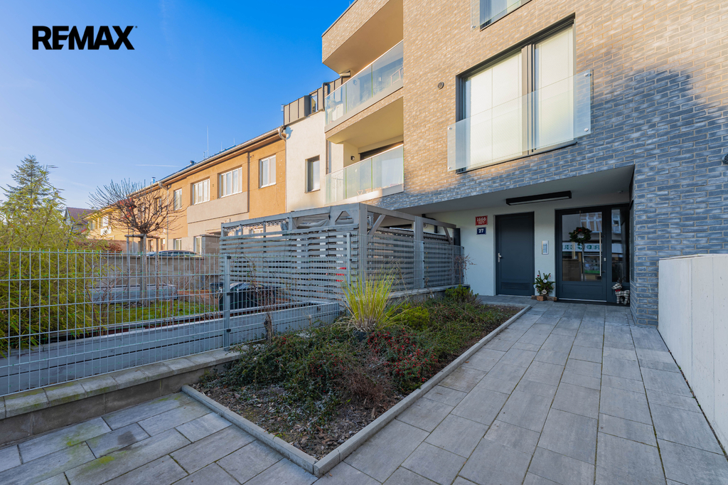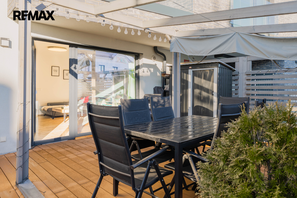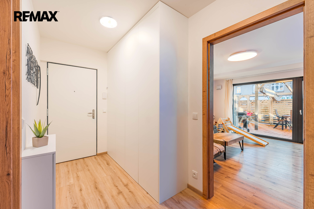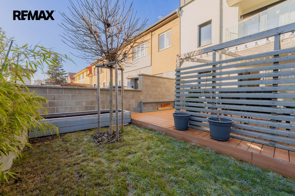 Byt disponuje plochou 71 m² a plocha včetně venkovních prostor a sklepní kóje činí 144 m². Velkou předností je prostorná terasa o velikosti 37 m² a navazující předzahrádka 34 m², které přirozeně rozšiřují obytný prostor a vytvářejí ideální místo pro každodenní relaxaci, rodinné posezení i trávení času s dětmi.