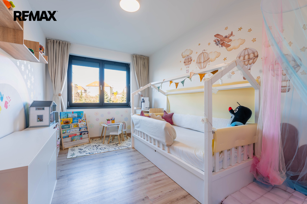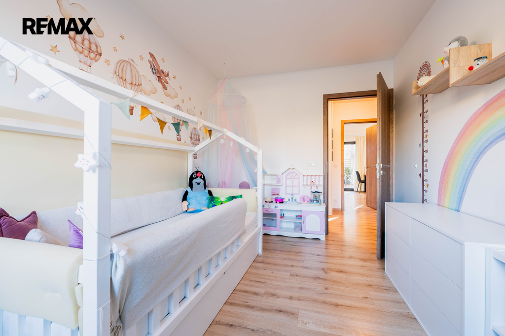 Interiér bytu je světlý, vzdušný a velmi dobře dispozičně řešený. Centrem bytu je obývací pokoj s kuchyňským koutem o velikosti 28 m², ze kterého je přímý vstup na terasu i předzahrádku. Dále byt nabízí samostatnou ložnici 16m² a dětský pokoj 13m². Samozřejmostí je koupelna, oddělené WC a praktická předsíň.