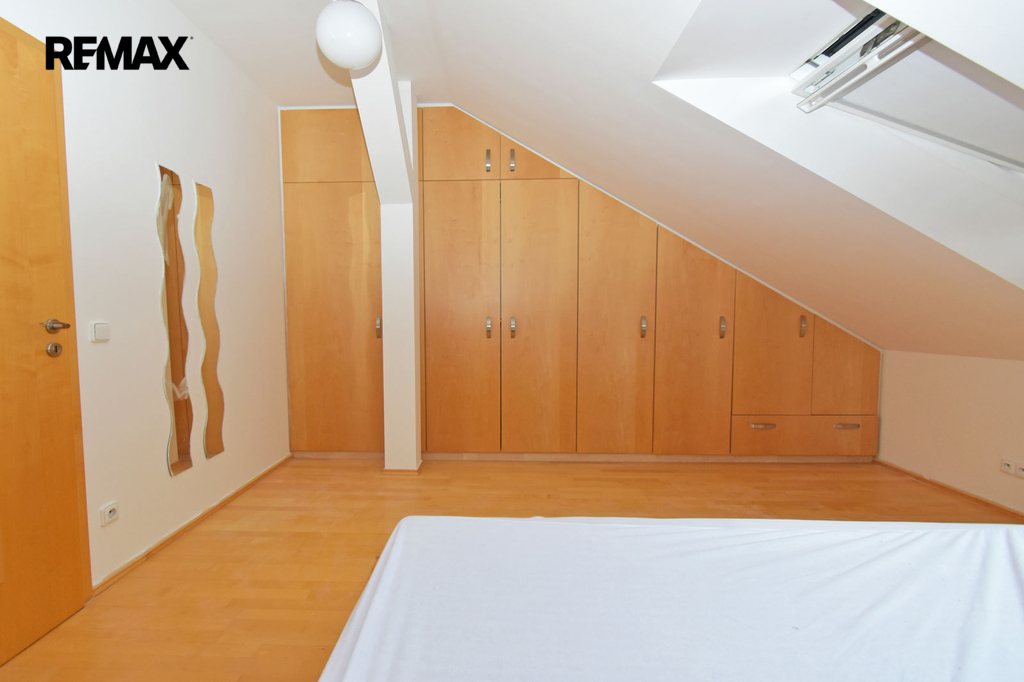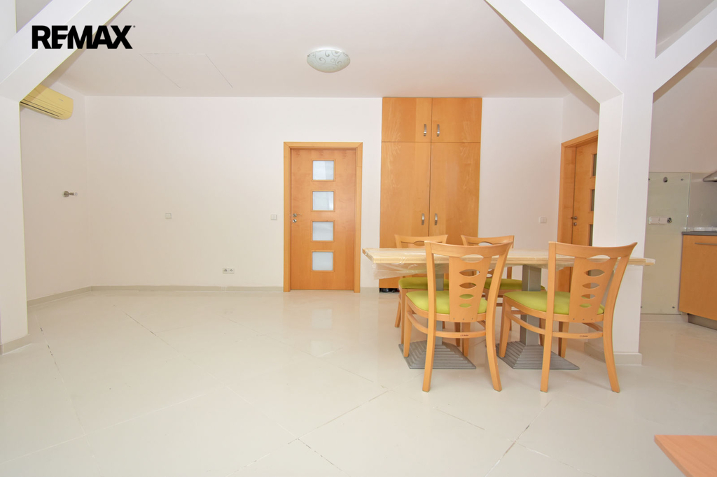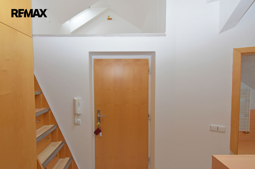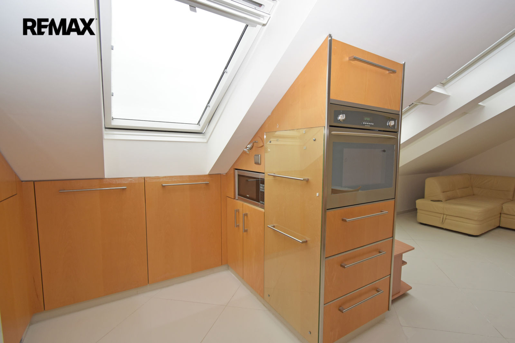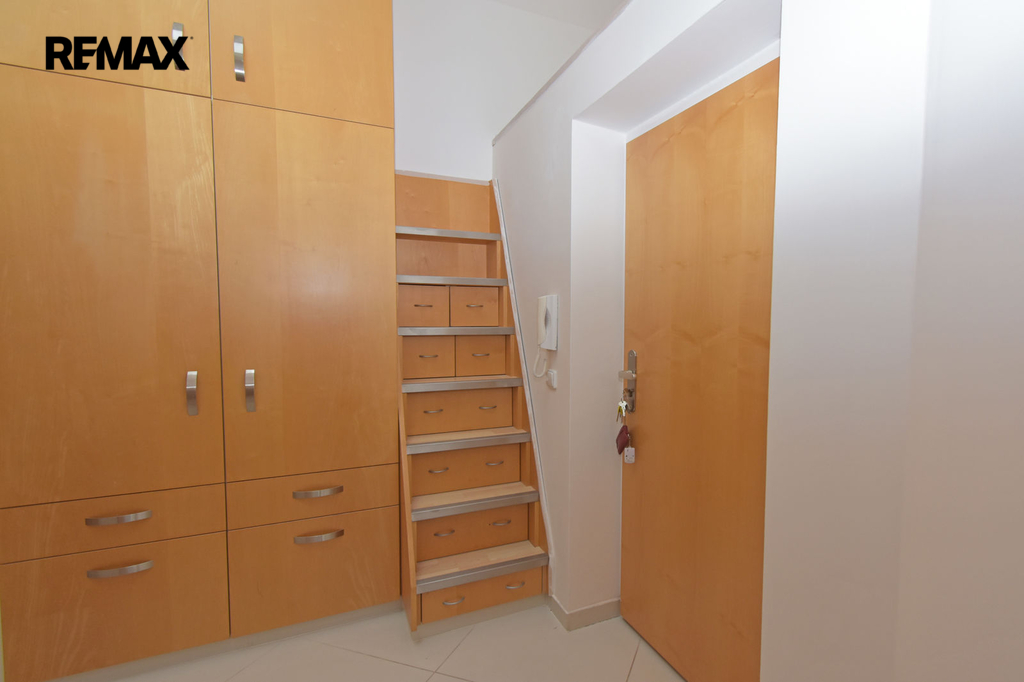 Dispozice bytu zahrnuje zádveří včetně vestavných úložných prostor a schody do vestavného patra. Úložné prostory se nachází i v jednotlivých schodech do vestavného patra. Dominantou bytu je prostorný světlý obývací pokoj s kuchyňským a jídelním koutem, který tvoří srdce celého domova. Moderní kuchyňská linka je vybavena sadou vestavných spotřebičů (sklokeramická varná deska, digestoř, elektrická trouba, mikrovlnná trouba a myčka). Byt disponuje dvěma samostatnými ložnicemi o velikosti 13 m² a 18 m², prostornou koupelnou (s rohovou vanou, umyvadlem se skříňkou, zrcadlem, místem na pračku a úložné prostory) a samostatnou toaletou s umyvadlem a bidetovou baterií. Součástí pronájmu jednotky je kuchyňská linka s vestavnými spotřebiči i veškeré zabudované vybavení – vestavné šatní skříně v celém bytě, manželská postel s úložným prostorem, sluneční a zatemňovací rolety, přípojky na internet a SAT včetně paraboly a připojení na společnou anténu, klimatizace s dálkovým ovládáním a kompletní osvětlovací tělesa. Podlahové krytiny tvoří plovoucí podlahy a dlažba. Součástí pronájmu je také užívání sklepa a 1x parkovací stání přímo u domu. Byt k dispozici ihned.