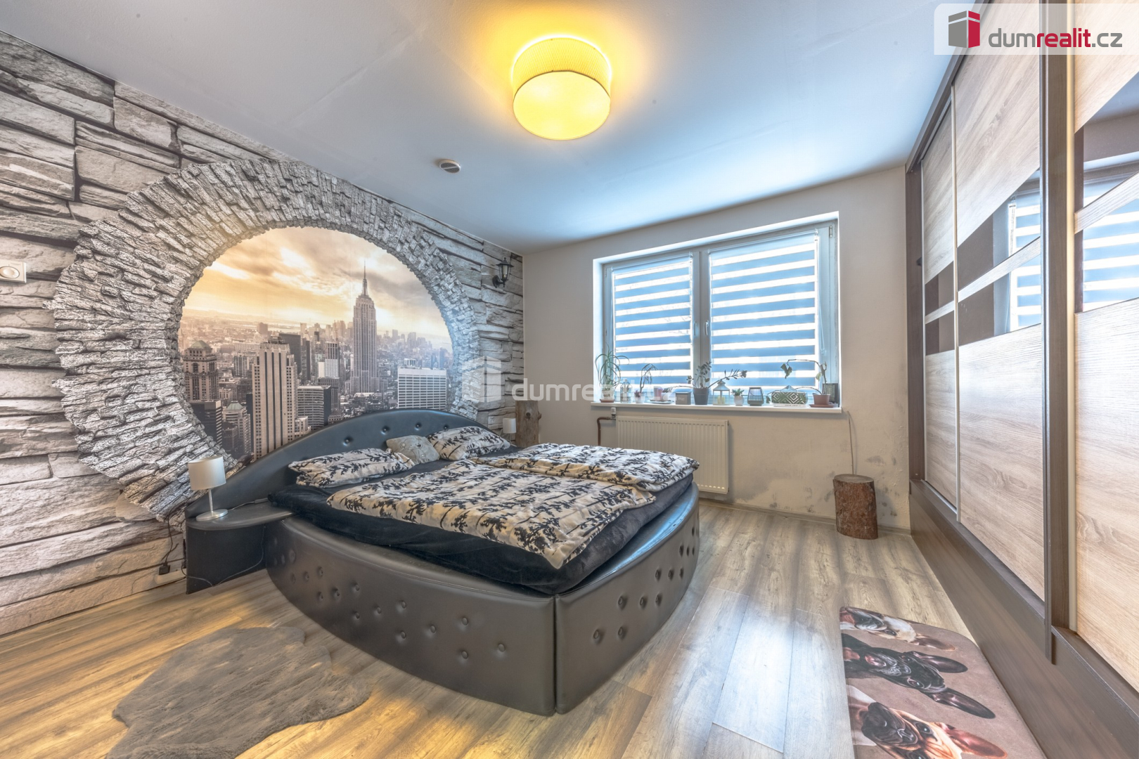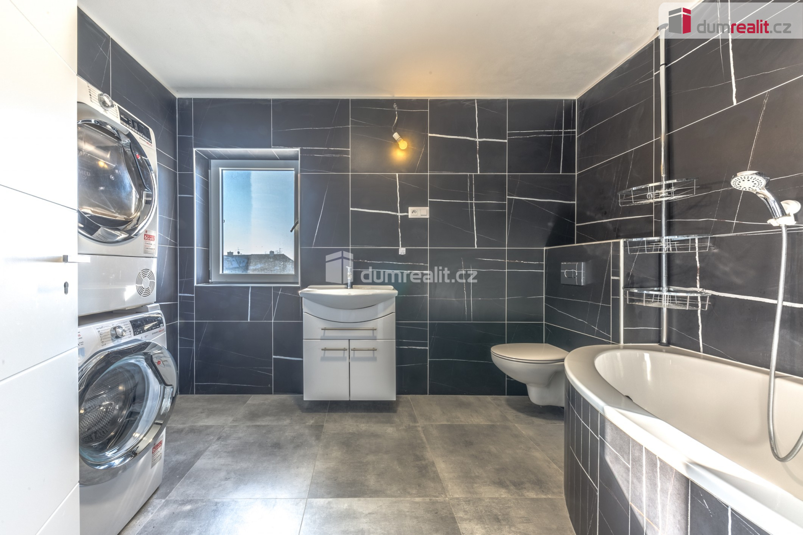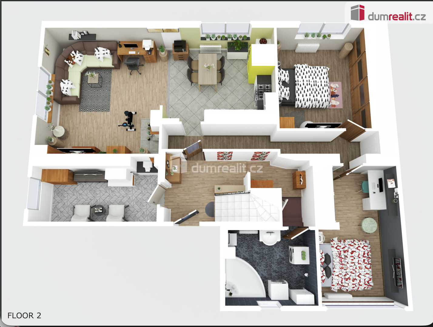 Moderněji koncipované podlaží, kterému vévodí světlý obývací pokoj propojený s kuchyňským koutem a jídelnou. Z obývacího pokoje je přímý vstup na velkou terasu (17 m²) s výhledem do zeleně, ideální pro letní snídaně nebo večerní relaxaci. Nachází se zde další tři samostatné neprůchozí pokoje a stylová koupelna s rohovou vířivou vanou.