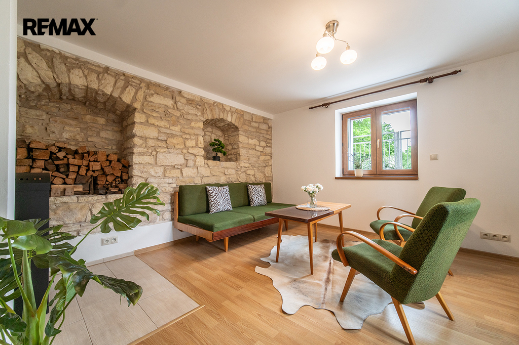 Byt je vytápěn podlahovým topením. K dispozici jsou i krbová kamna.