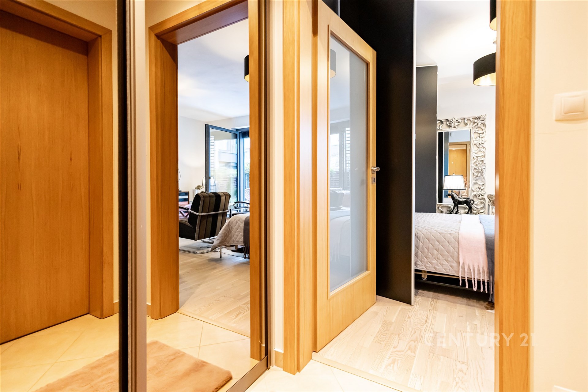 Interiér bytu je kompletně vybaven nejen nábytkem a designovými doplňky, ale i veškerým vybavením pro každodenní život – od kuchyňského nádobí, příborů a spotřebičů až po ložní prádlo, peřiny či praktické detaily, jako je napařovací žehlička. Kuchyň je plně vybavena vestavěnými spotřebiči včetně trouby, mikrovlnné trouby a myčky nádobí. Samozřejmostí je také pračka, která je prakticky umístěna v koupelně. Stačí si přinést osobní věci a můžete okamžitě bydlet.