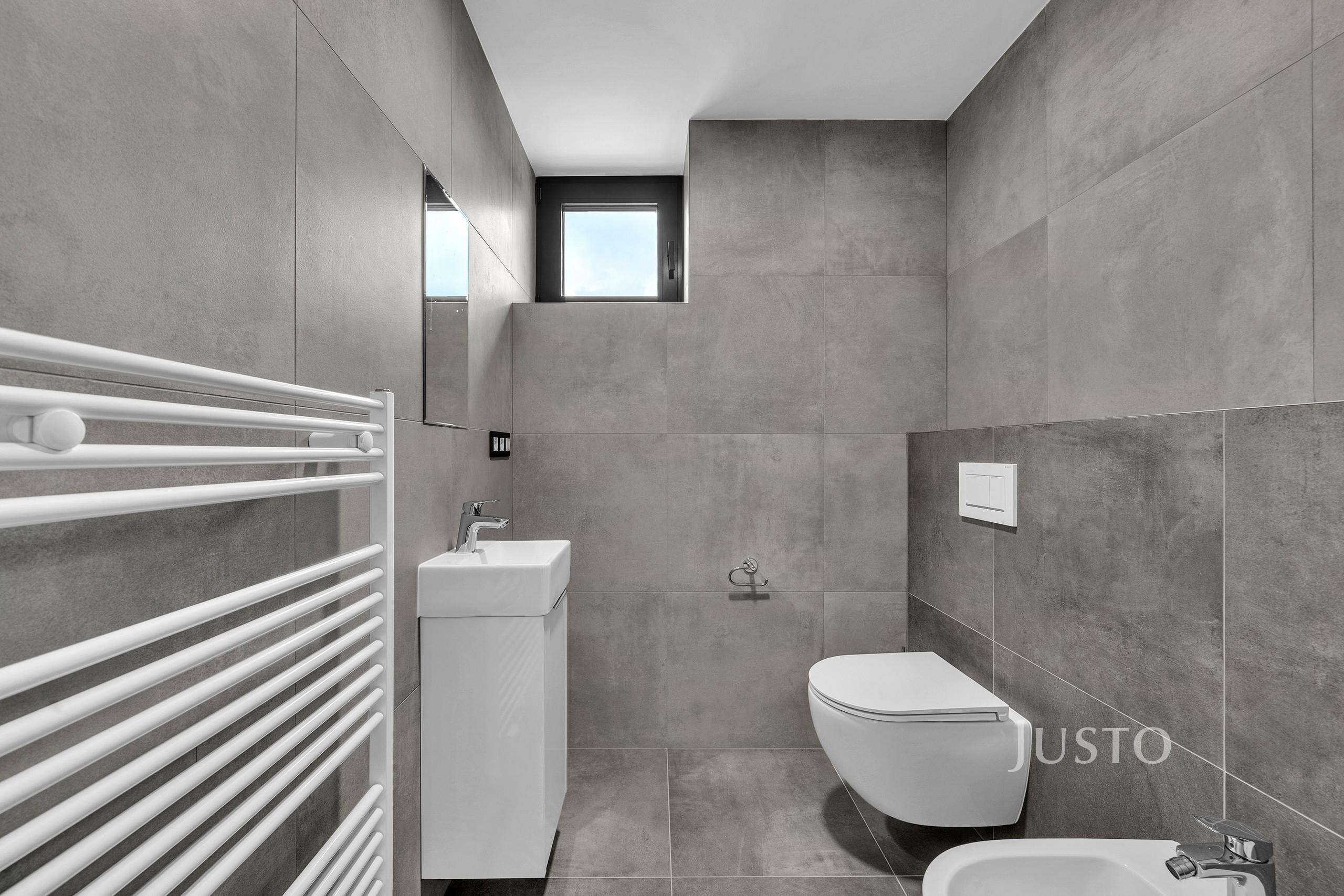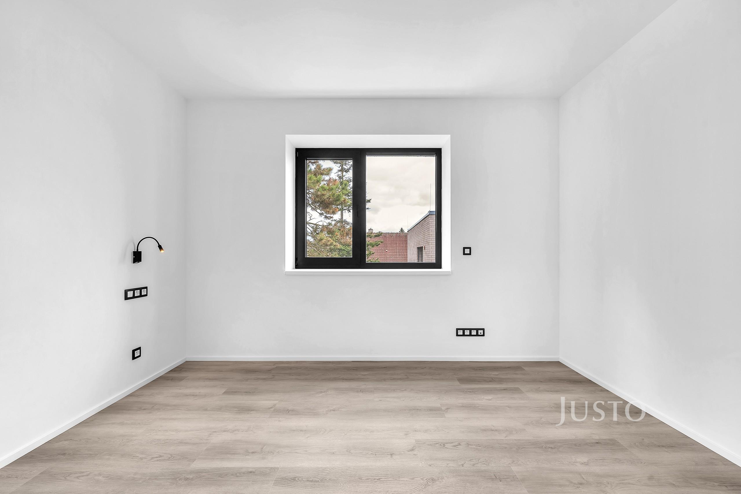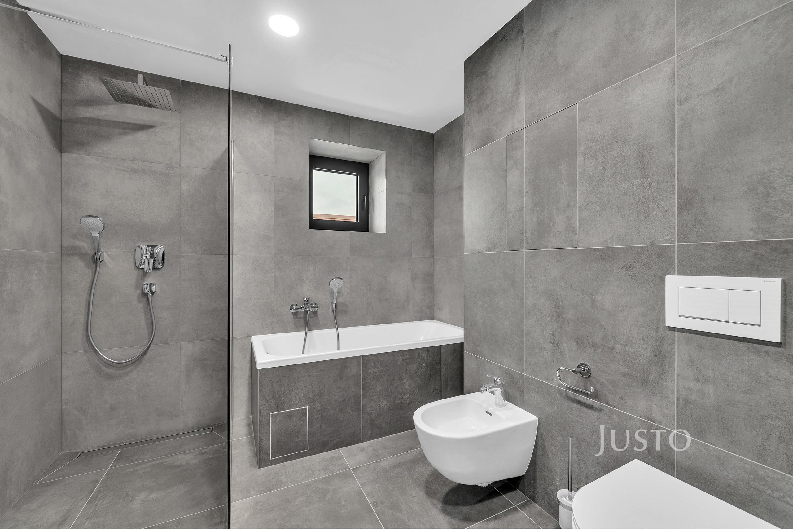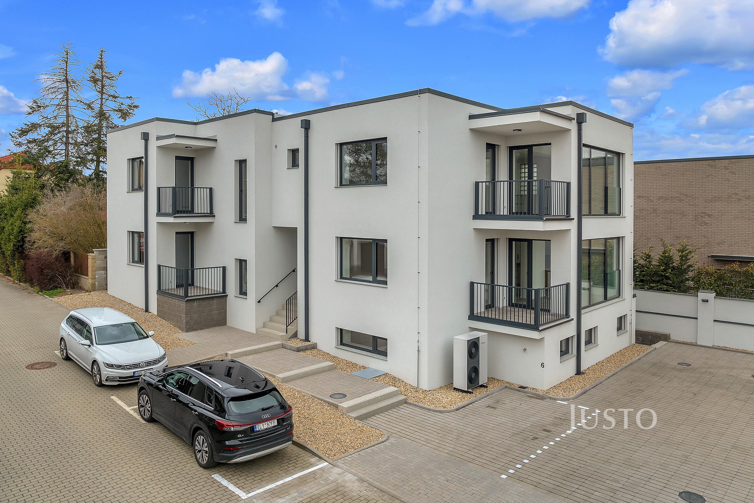 Interiér bytu je světlý díky velkým hliníkovým oknům s venkovními roletami. Podlahové vytápění s tepelným čerpadlem zajišťuje příjemné klima po celý rok, komfort umocňuje i klimatizace. V koupelnách dominuje kvalitní velkoformátová dlažba a moderní sanita. Díky preciznímu zpracování a promyšlenému designu poskytuje byt vysoký standard bydlení.