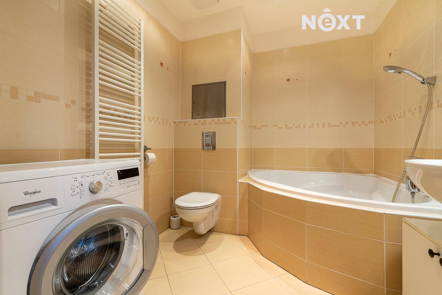 Prostorná koupelna je spojená s WC, osazena rohovou vanou a automatickou pračkou.