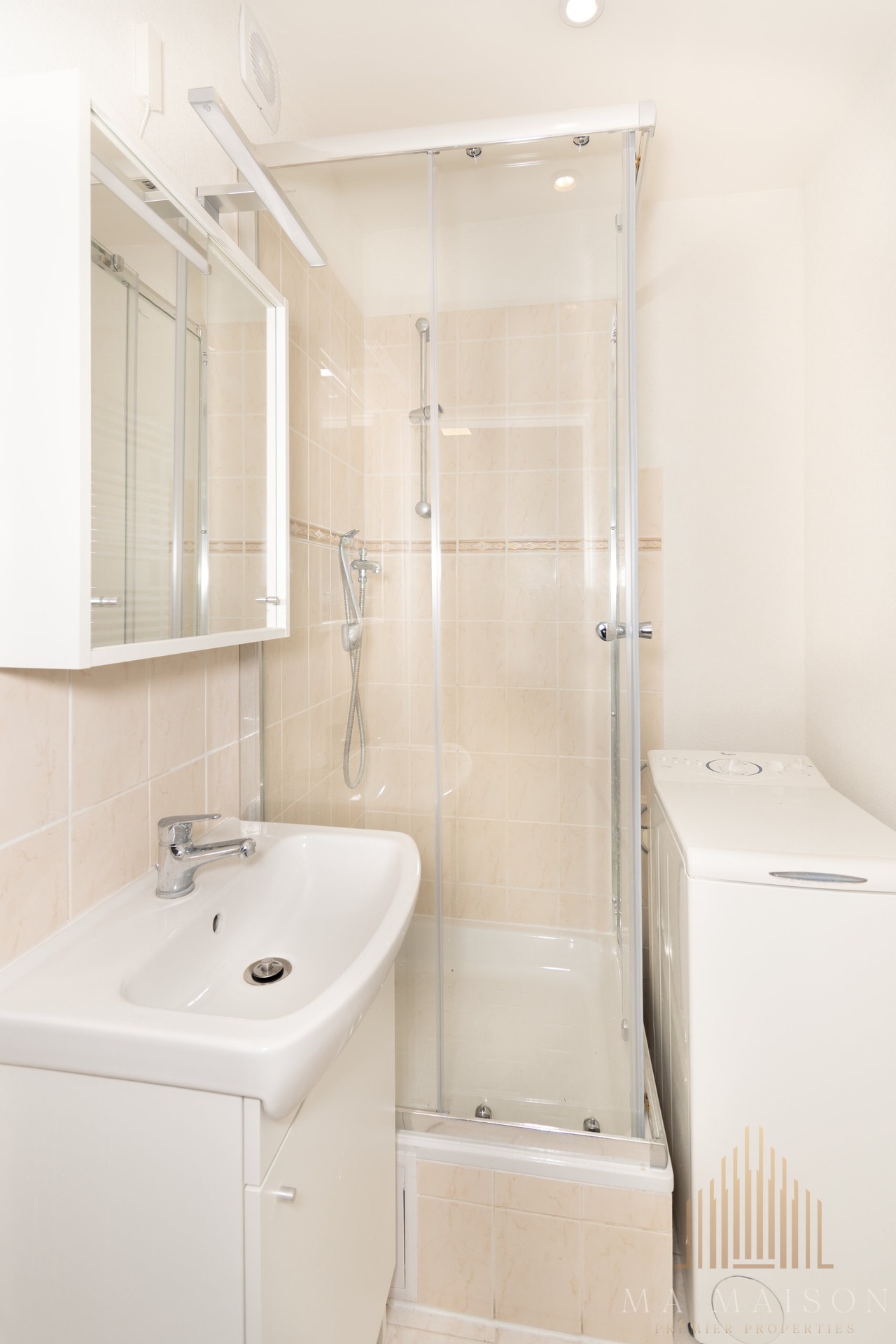 - koupelna se sprchovým koutem, umyvadlem se skříňkou, zrcadlem, toaletou a pračkou.