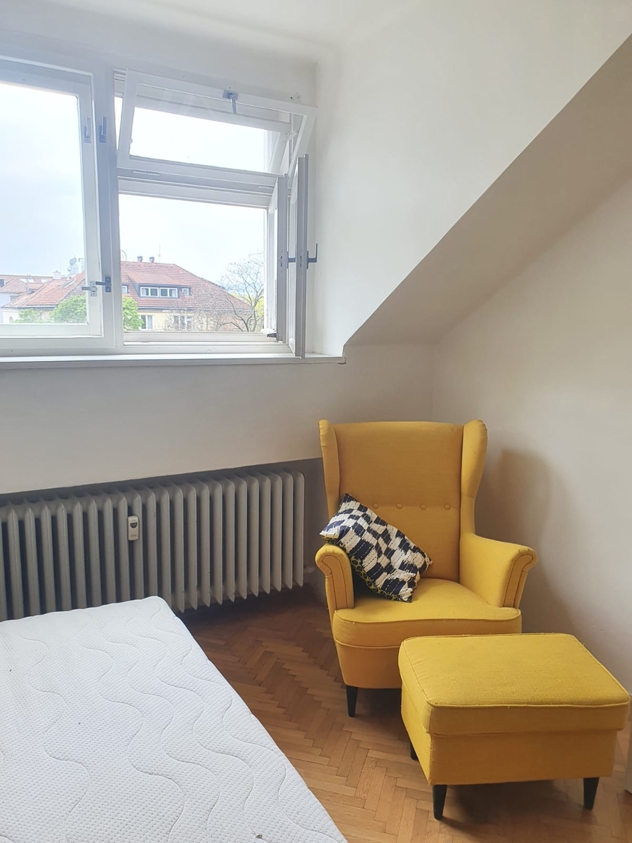 Byt je orientovaný je na jih s okny do klidného vnitrobloku s výhledem na střechy Smíchova.