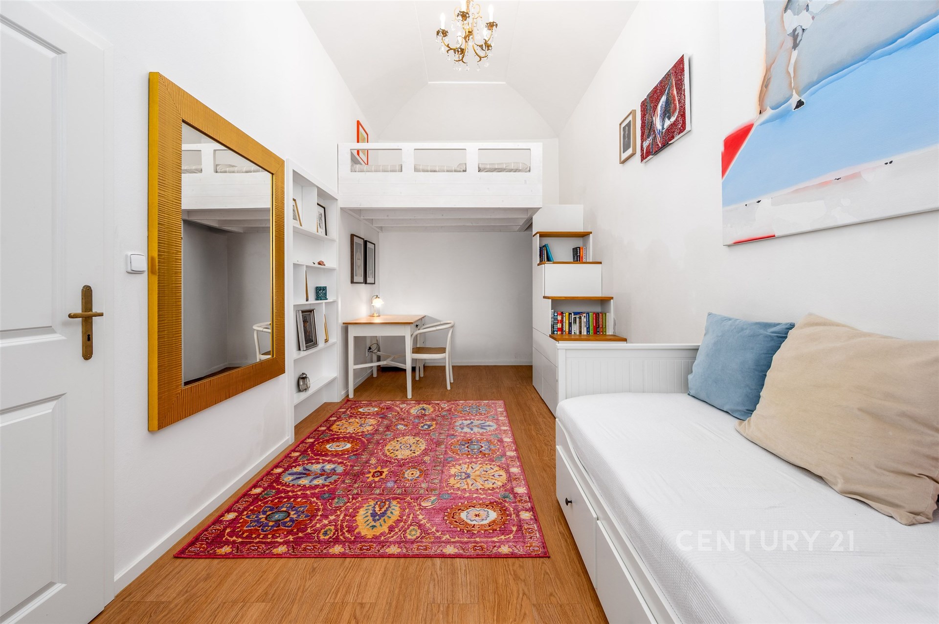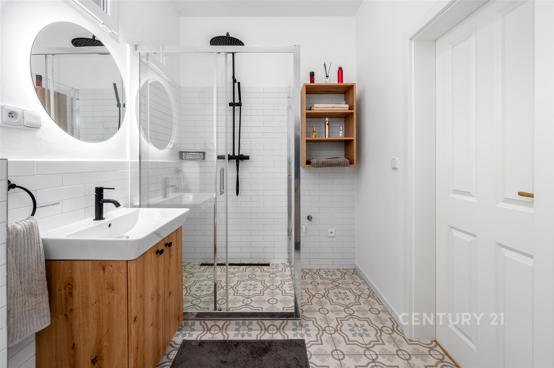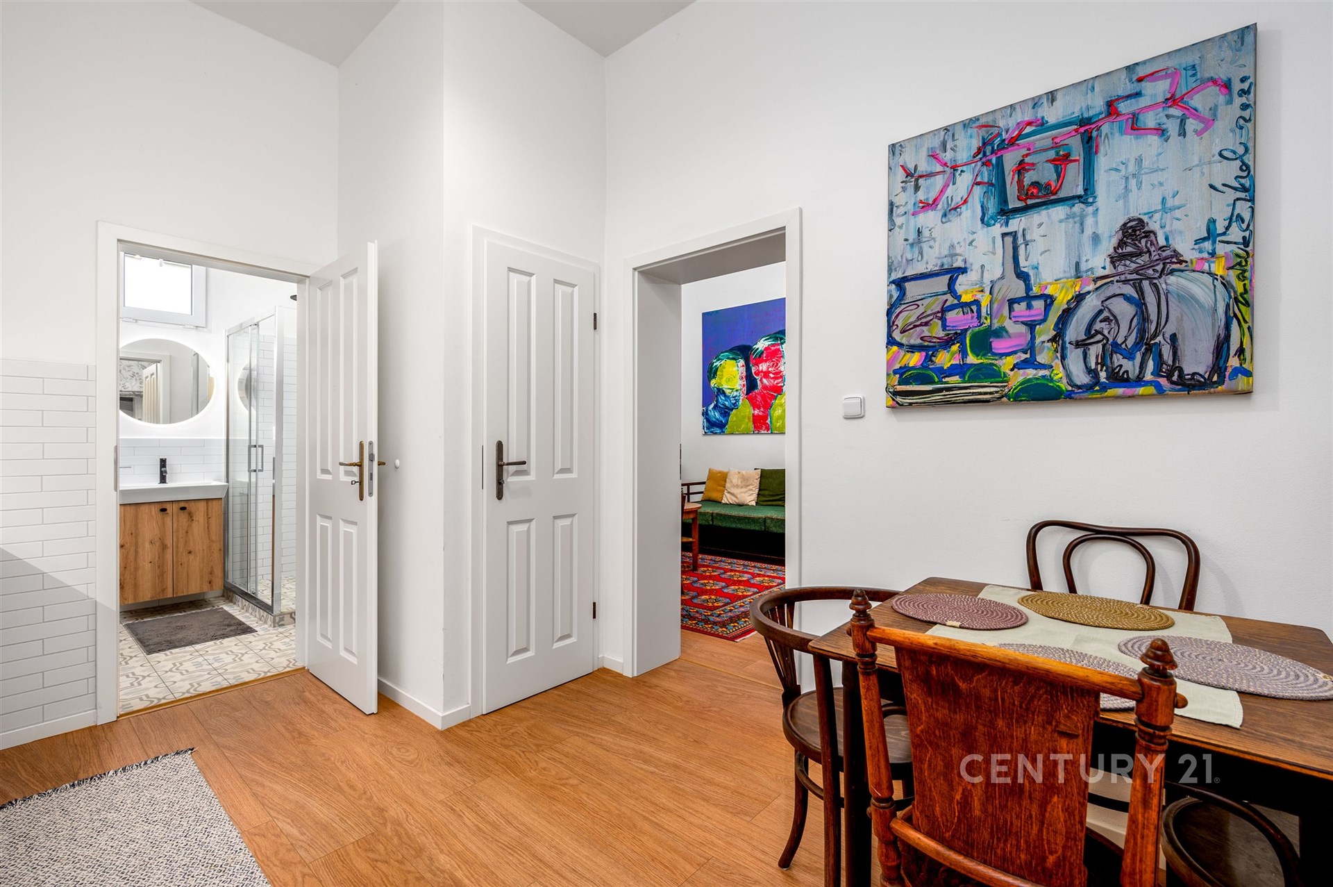 Dominantou bytu je prostorný obývací pokoj, který působí velmi vzdušně a útulně zároveň. Interiér je vkusně zařízen historizujícím dřevěným nábytkem, což dodává bytu jedinečný charakter. Samostatná ložnice je řešena prakticky a nabízí chytré řešení s patrem na spaní a pracovním koutem, díky čemuž je prostor efektivně využit pro odpočinek i práci. Kuchyně je laděna do čistého bílého designu, který je zajímavě doplněn retro spotřebiči a vytváří tak stylový kontrast mezi moderním a dobovým stylem.