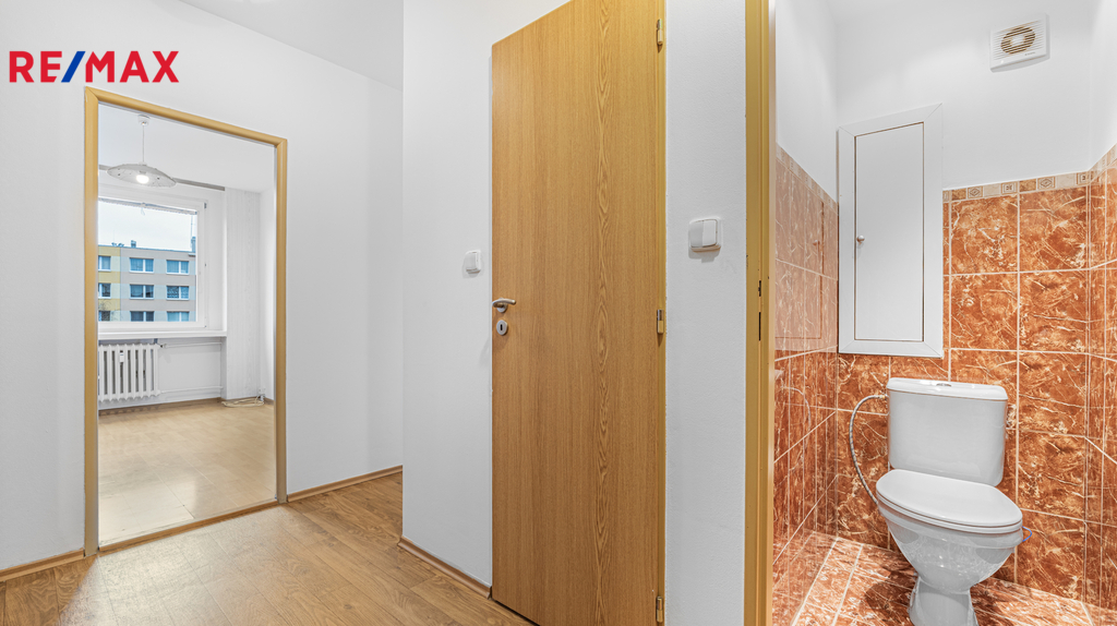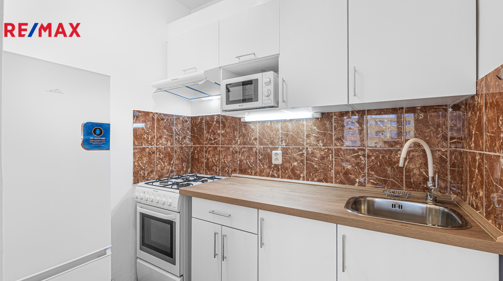 Byt je nezařízený, včetně vybavení, které můžete vidět na fotkách inzerátu, což umožňuje novým nájemníkům zařídit si interiér dle vlastních představ a potřeb. V bytě naleznete oddělenou toaletu a koupelnu s rohovým sprchovým koutem a pračkou. Kuchyňský kout je vybaven plynovým sporákem, mikrovlnou troubou a lednicí s mrazákem. K bytu náleží malá uzamykatelná komora nacházející se před vstupem do bytu, která je vhodná například jako botník. V domě je k dispozici výtah, což usnadňuje každodenní pohyb a přístup do bytu. Topení je zajištěno radiátory