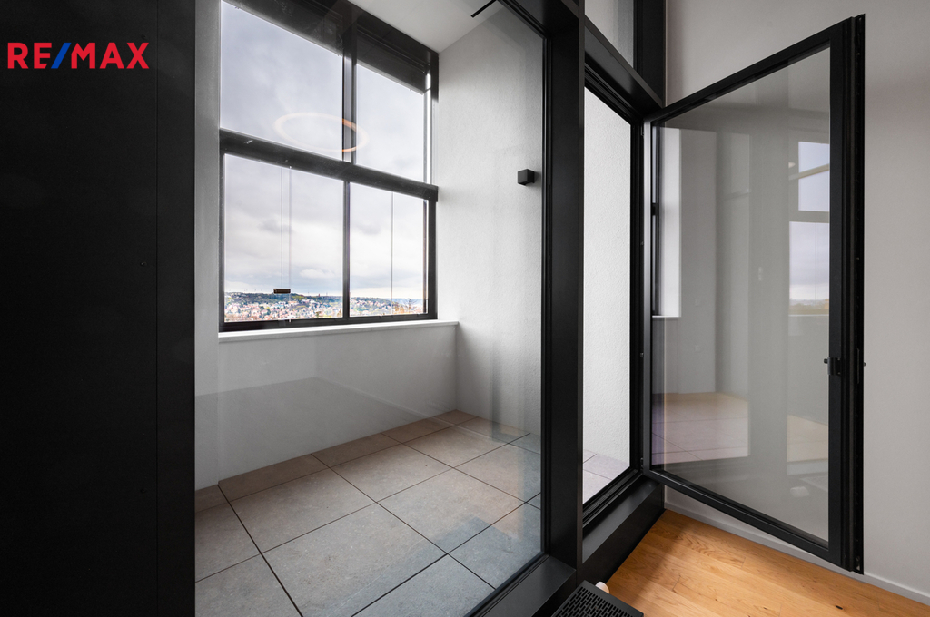 Interiér tvoří světlý obývací pokoj s kuchyňským koutem na míru, vybaveným myčkou, elektrickou troubou a indukční varnou deskou. Z obývací části je vstup na prosklenou lodžii s panoramatickým výhledem na Prahu. Ložnice disponuje vestavěnými skříněmi a vstupem do vyvýšené galerie, kterou lze využít jako šatnu, úložný prostor nebo pracovnu.