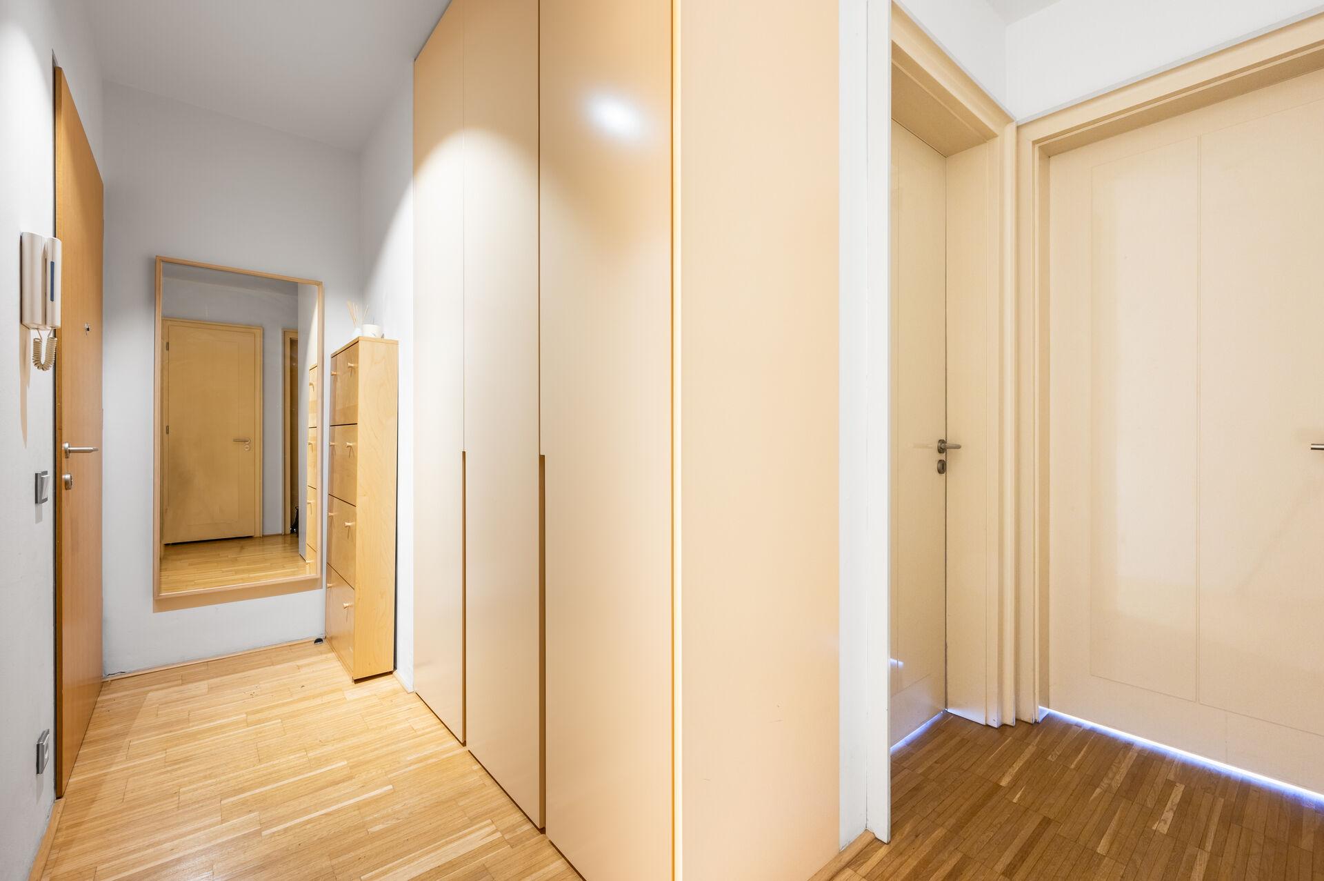 Dispozici bytu tvoří předsíň s vestavěnou skříní, prostorný obývací pokoj, jídelní část s kuchyňským koutem, plně vybavená spotřebiči, ložnice včetně postele, koupelna s vanou a samostatné WC. Podlahy dřevěné, vnitřní žaluzie, klimatizace, domácí telefon.