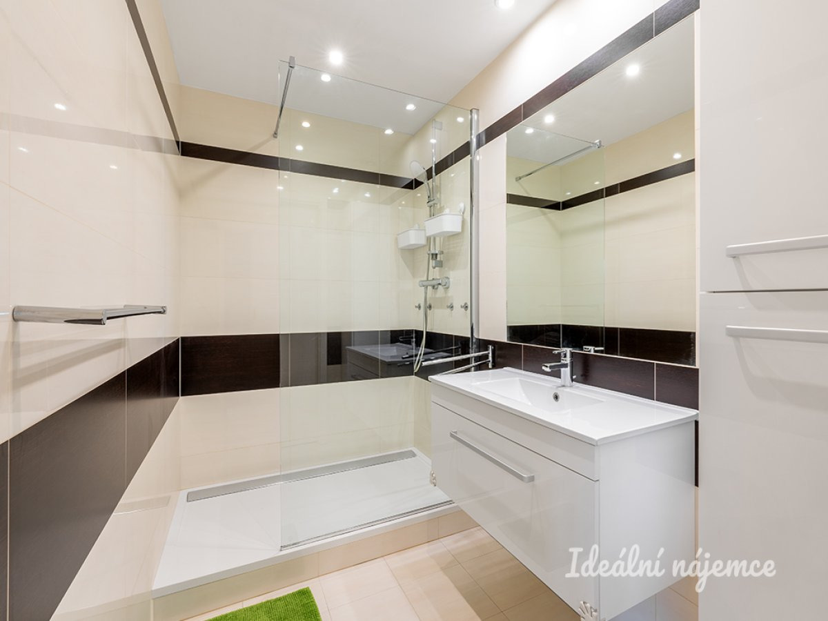 Z vstupní předsíně (ve které nalezneme vestavěné šatní skříně s pračkou a sušičkou) je možné vstoupit na samostatnou toaletu s umyvadlem a bidetovou sprškou, či do koupelny s prostorným sprchovým koutem s odtokovým žlábkem a zástěnou.