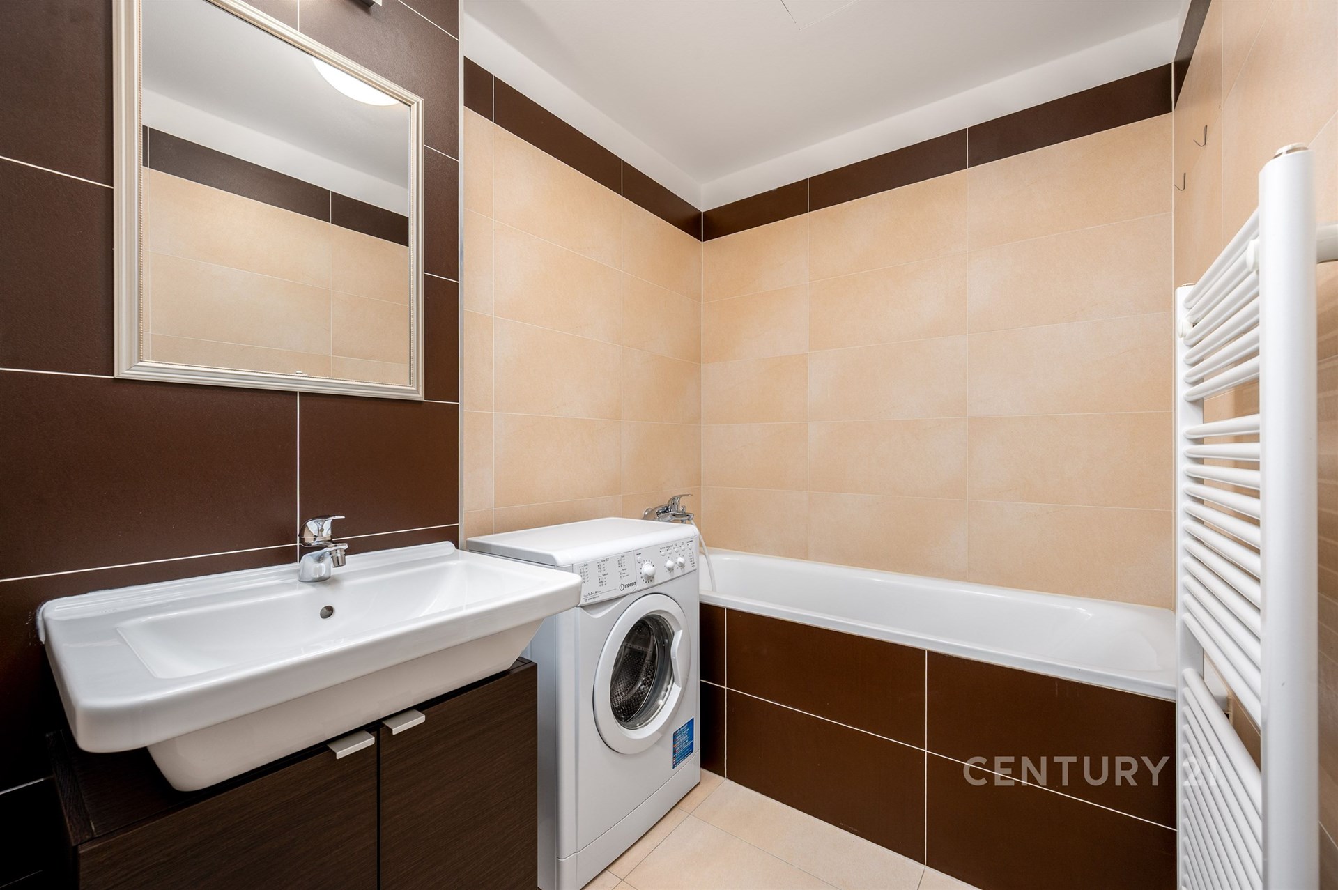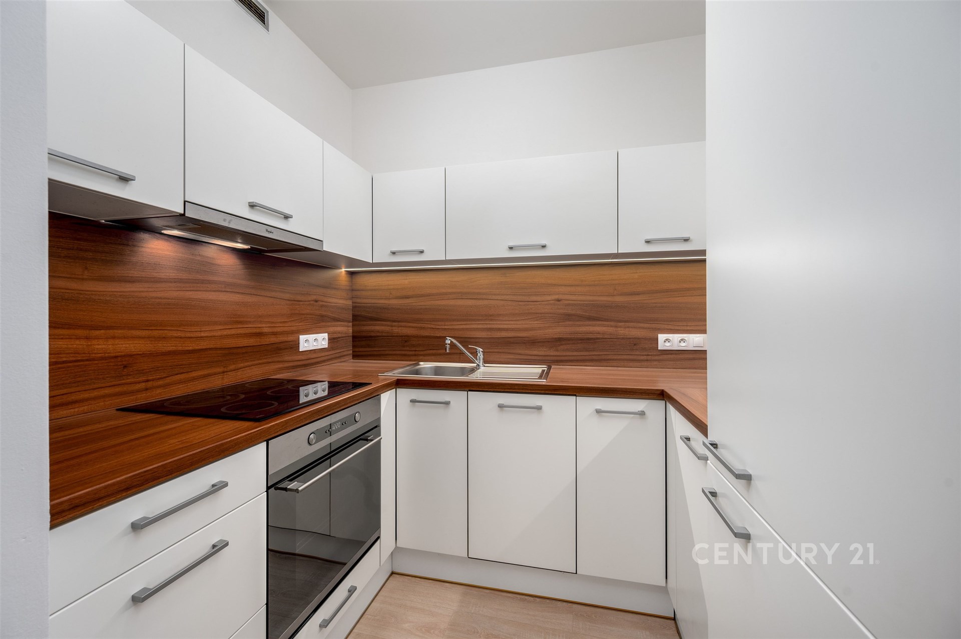 Dispozice a vybavení: Vstupní chodba, koupelna s vanou, umyvadlem, pračkou a samostatná toaleta, obývací pokoj s kuchyňským koutem, vybaveným kuchyňskou linkou ( multifunkční trouba a varná deska, digestoř, lednice a myčka nádobí) a ložnice. K bytu náleží sklep a vyhrazené garážové stání v suterénu domu.