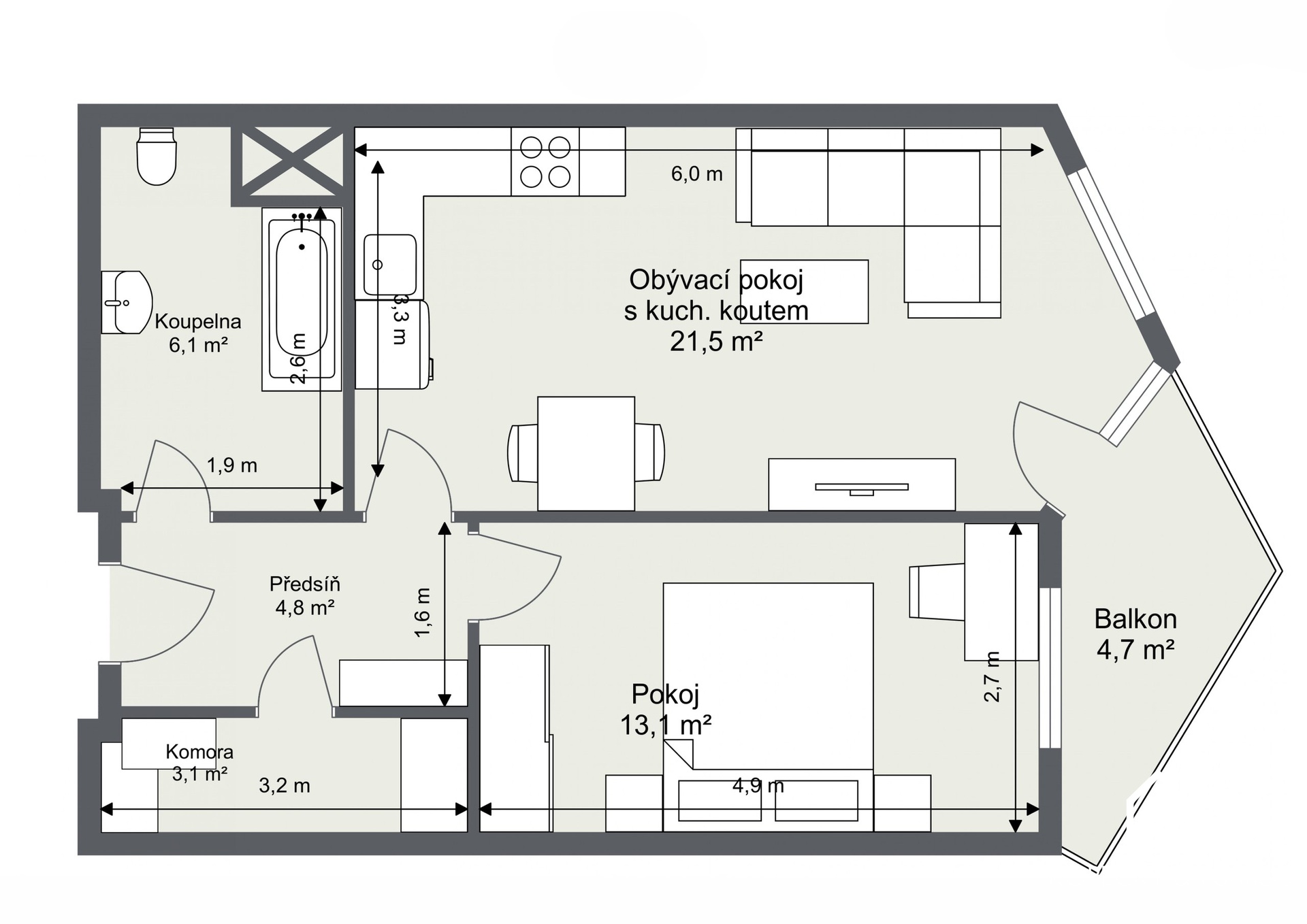 | Dispozice/podlahová plocha: | 2+kk/49 m² |
