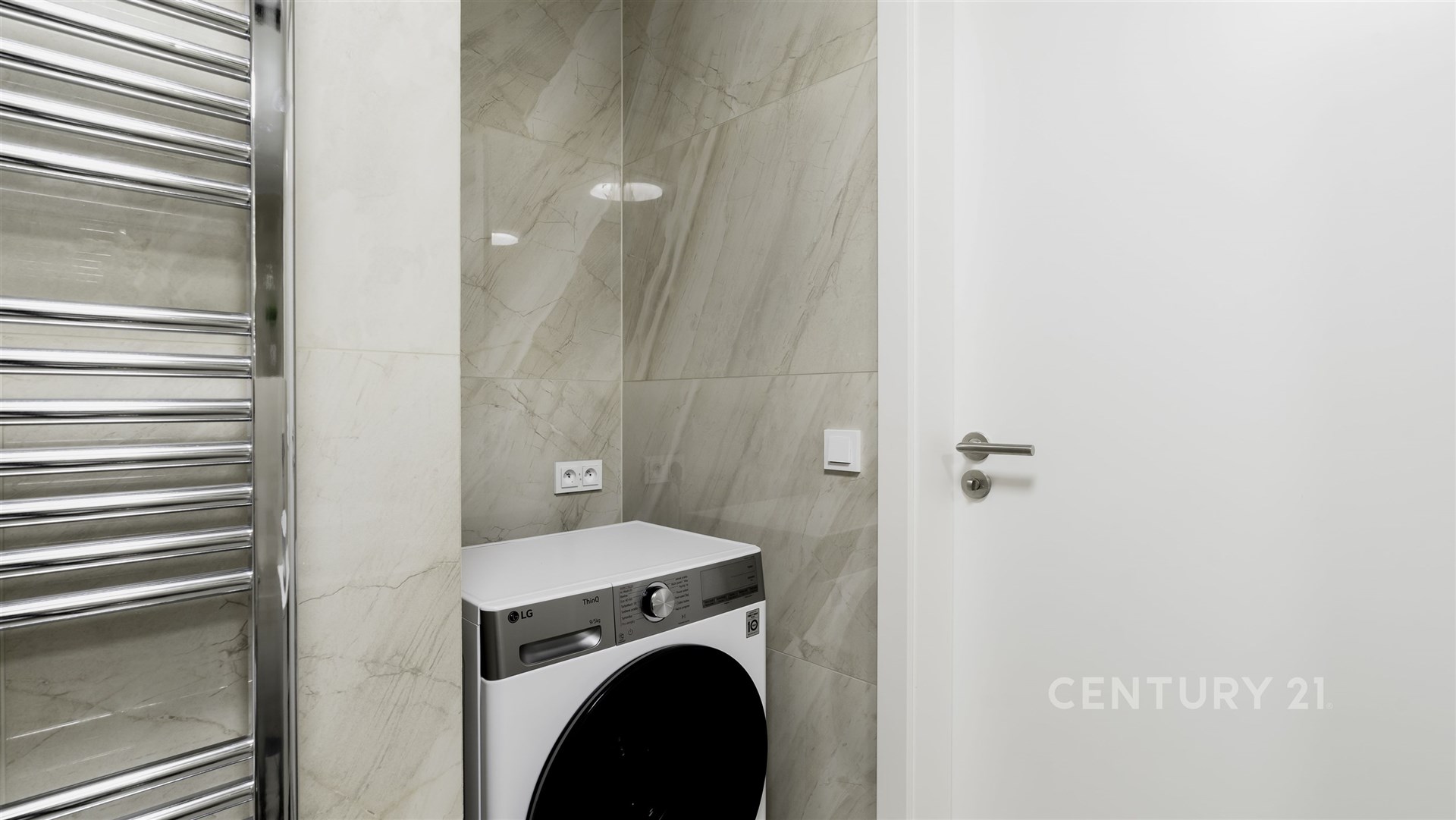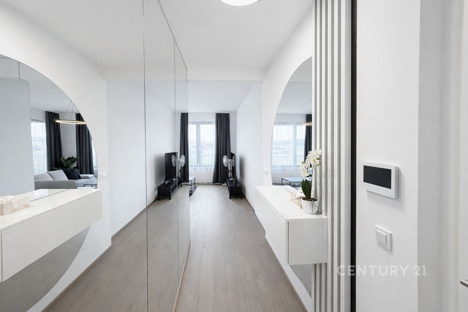 Byt nabízí prostorný obývací pokoj s luxusní, plně vybavenou kuchyní s prémiovými spotřebiči, ložnici, koupelnu s toaletou, pračkou a sušičkou a chodbu se skříněmi na míru.