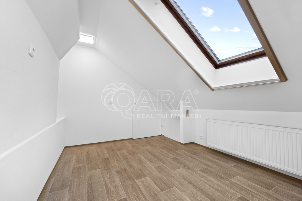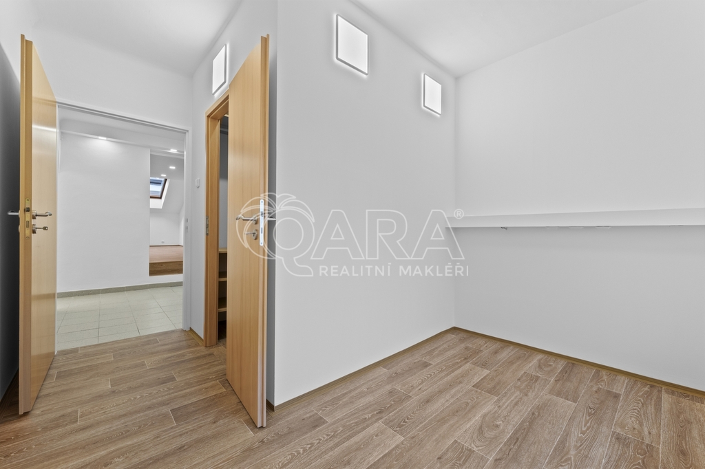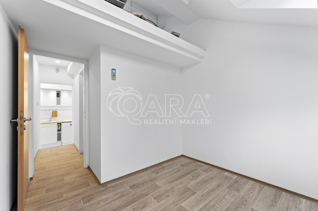Byt se skládá ze vstupní chodby s věšákem a zrcadlem, samostatné kuchyně s plně vybavenou kuchyňskou linkou a navazující jídelny s dostatkem prostoru pro jídelní stůl. Podlahové vytápění zde zajišťuje příjemný komfort při každodenním užívání. Součástí bytu je dále velkorysá místnost vhodná jako hlavní obytný prostor, která disponuje patrem na spaní a umožňuje variabilní uspořádání nábytku. Největší pokoj v bytě lze využít jako hlavní ložnici, obývací pokoj nebo samostatnou bytovou jednotku v rámci dvougeneračního řešení – v případě zájmu je zde možné vybudovat druhou kuchyň.