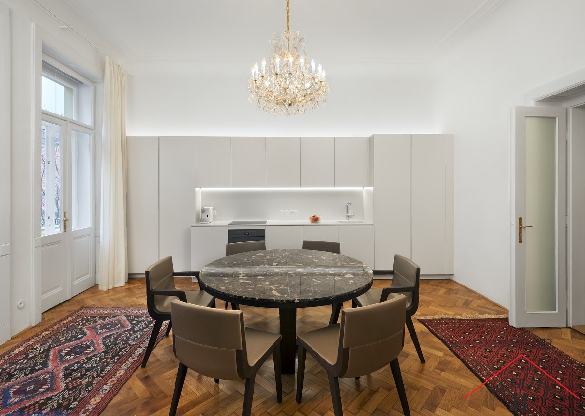 V bytě jsou parketové podlahy, štukové stropy a křišťálové lustry.