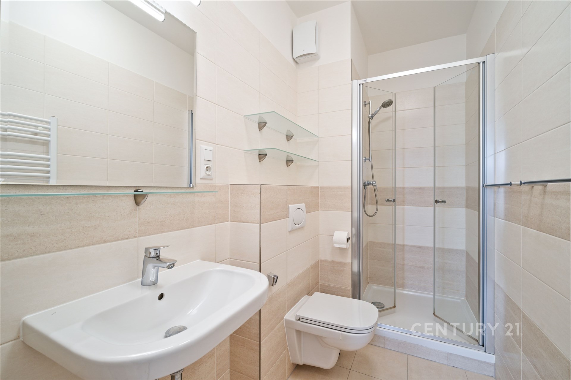 Byt tvoří prostorný obývací pokoj s kompletně zařízeným kuchyňským koutem (lednice, mrazák, digestoř, trouba, myčka na nádobí) a se vstupem na balkon. Tři neprůchozí ložnice jedna s vlastní koupelnou. Z chodby vstup do další koupelny s vanou, samostatného WC a prostorné komory. K dispozici velké množství vestavěných skříní, jinak byt nevybaven. V celém bytě jsou instalována trojitá okna ( vynikající zvuková i tepelná izolace ).