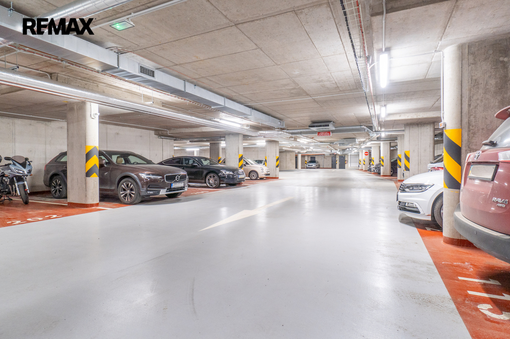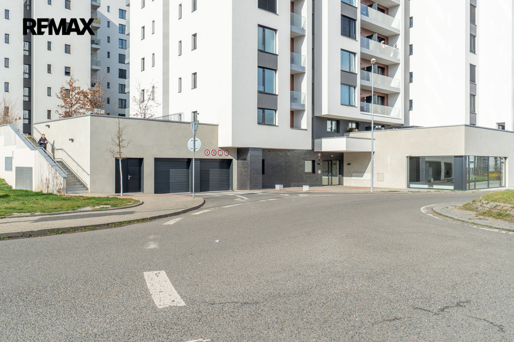 Vjezd do garáže je přes automatická vrata na dálkové ovládání, přístup mají pouze vlastníci a nájemci objektu.