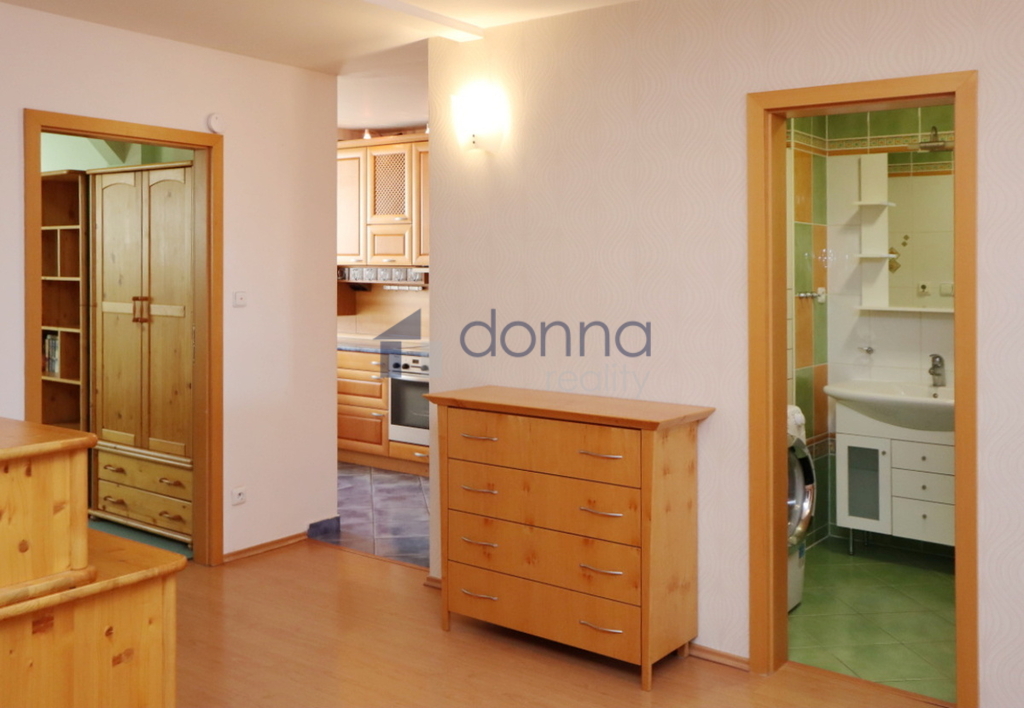 Byt je zařízen a sestává ze dvou ložnic, kuchyně, jídelny, koupelny s vanou, WC a předsíně s vestavěnými skříněmi a točitým schodištěm do vyššího patra, kde se nachází prostorný obývací pokoj se zimní zahradou a pracovním koutem, koupelnou se sprchou a s dalším WC, saunou a velkou terasou (13m2) s grilem a krásným výhledem na Pražský hrad a Petřín.