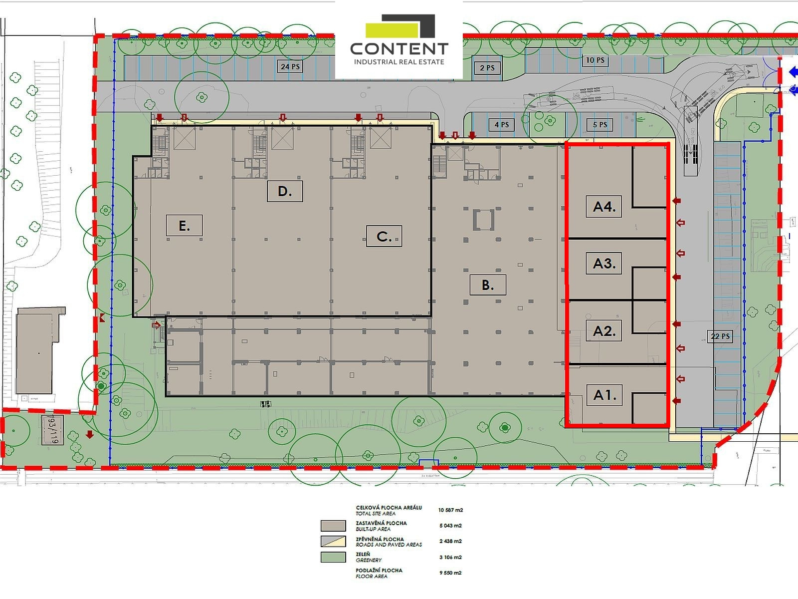 - lze rozdělit na samostatné komerční jednotky (SBU) od cca 200 m² + zázemí (A1+A2+A3+A4)