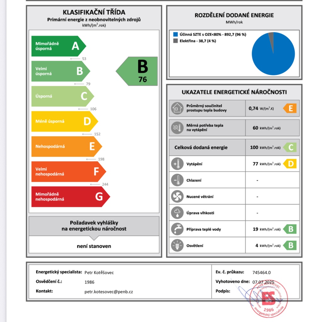 - Ukazatel energetické náročnosti budovy: 76 kWh/m²