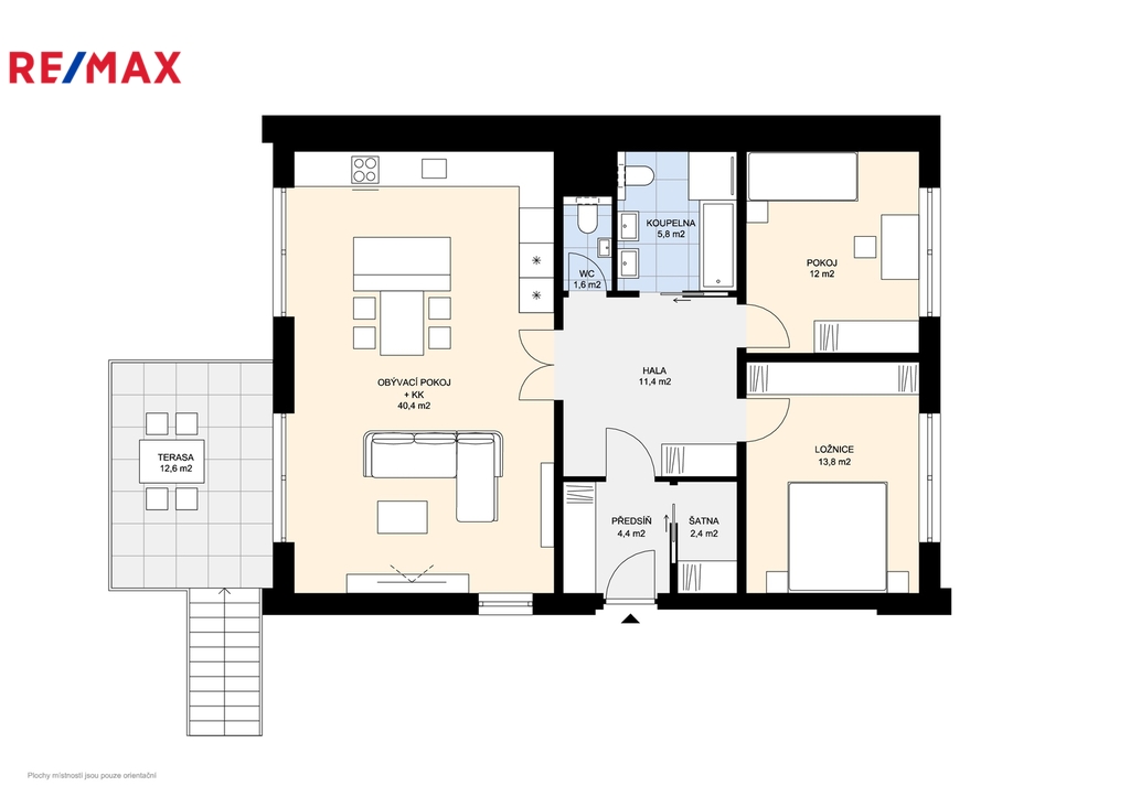 Dispozici tvoří prostorný obývací pokoj s kuchyňským koutem o velikosti 40,4 m², dva samostatné pokoje (13,8 m² a 12,0 m²), hala (11,4 m²), koupelna (5,8 m²), samostatné WC (1,6 m²), šatna (2,4 m²) a chodba (4,4 m²). + terasa 12m2.