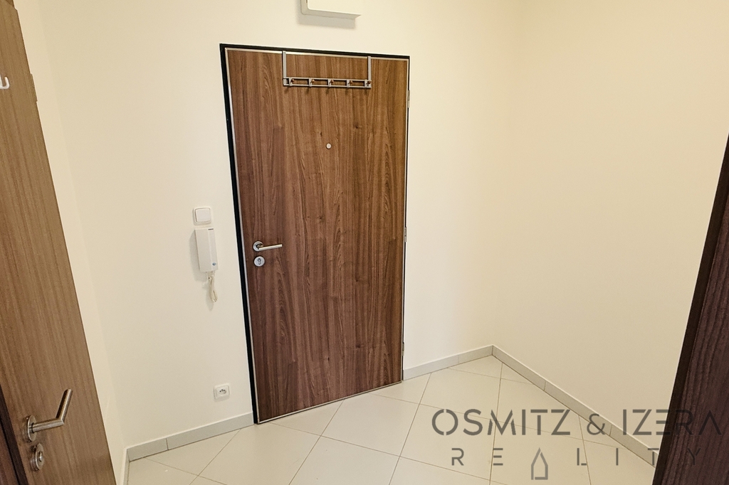 Při vstupu do bytové jednotky se nacházíme v předsíni, odtud se dostaneme buď do hlavní místnosti v podobě obývacího pokoje s kuchyní nebo do koupelny s vanou a toaletou. Byt je šikovně řešený, protože tvar hlavní místnosti představuje písmeno „L“, takže postel je v podstatě schovaná a tak oddělena od obývací místnosti s kuchyňským koutem. Kuchyň je vybavená malou lednici, myčkou, sklokeramickou deskou a troubou. V předsíni bude doplněna velká skříň. Také pračku je v případě požadavku nájemníka dodat.