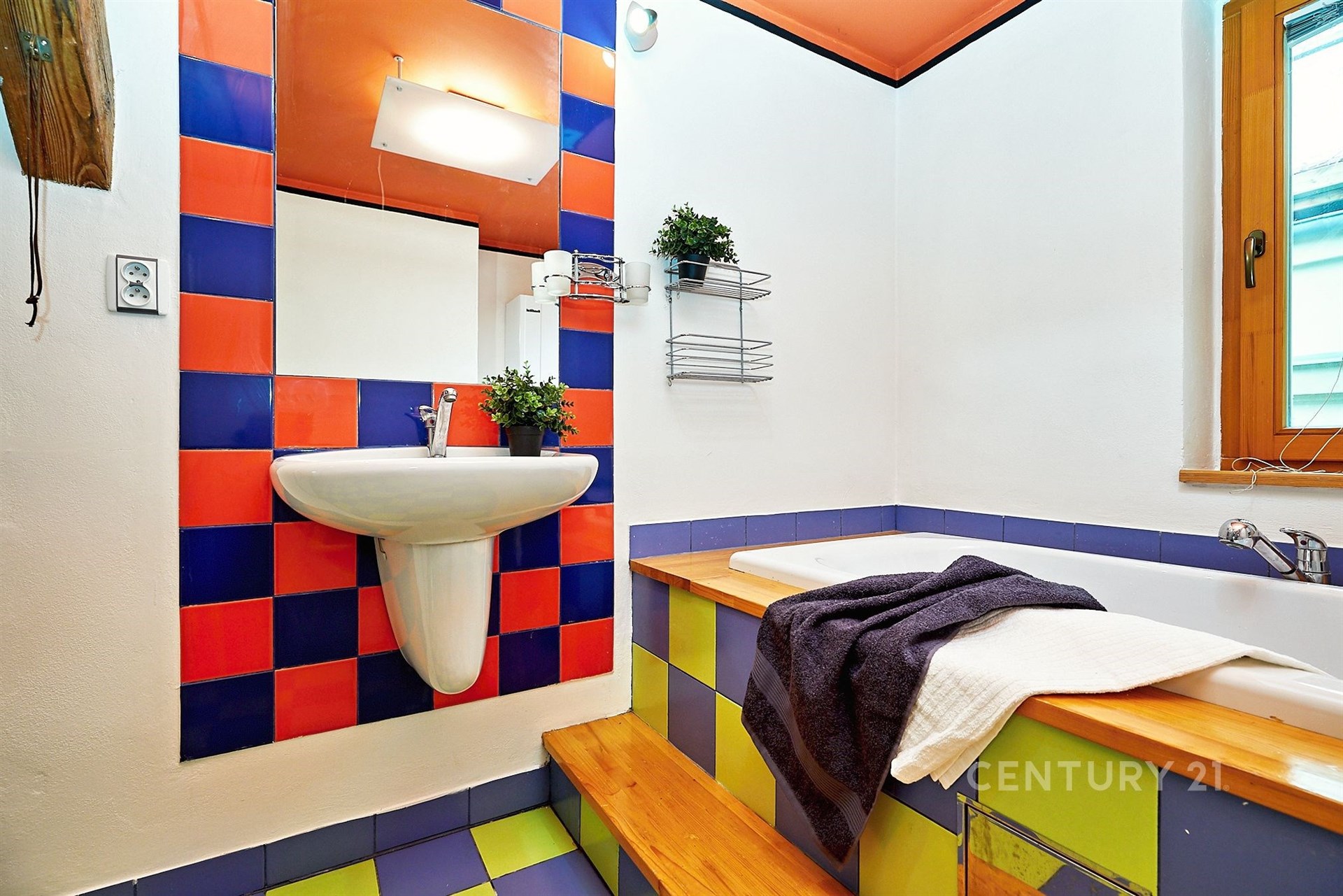 • Koupelna a WC: Moderní koupelna s vanou, sprchovým koutem a pračkou. Díky dvěma oknům má dostatek denního světla. Stropy jsou nově vymalovány bílou barvou místo oranžové na fotografii. Toaleta je oddělená.