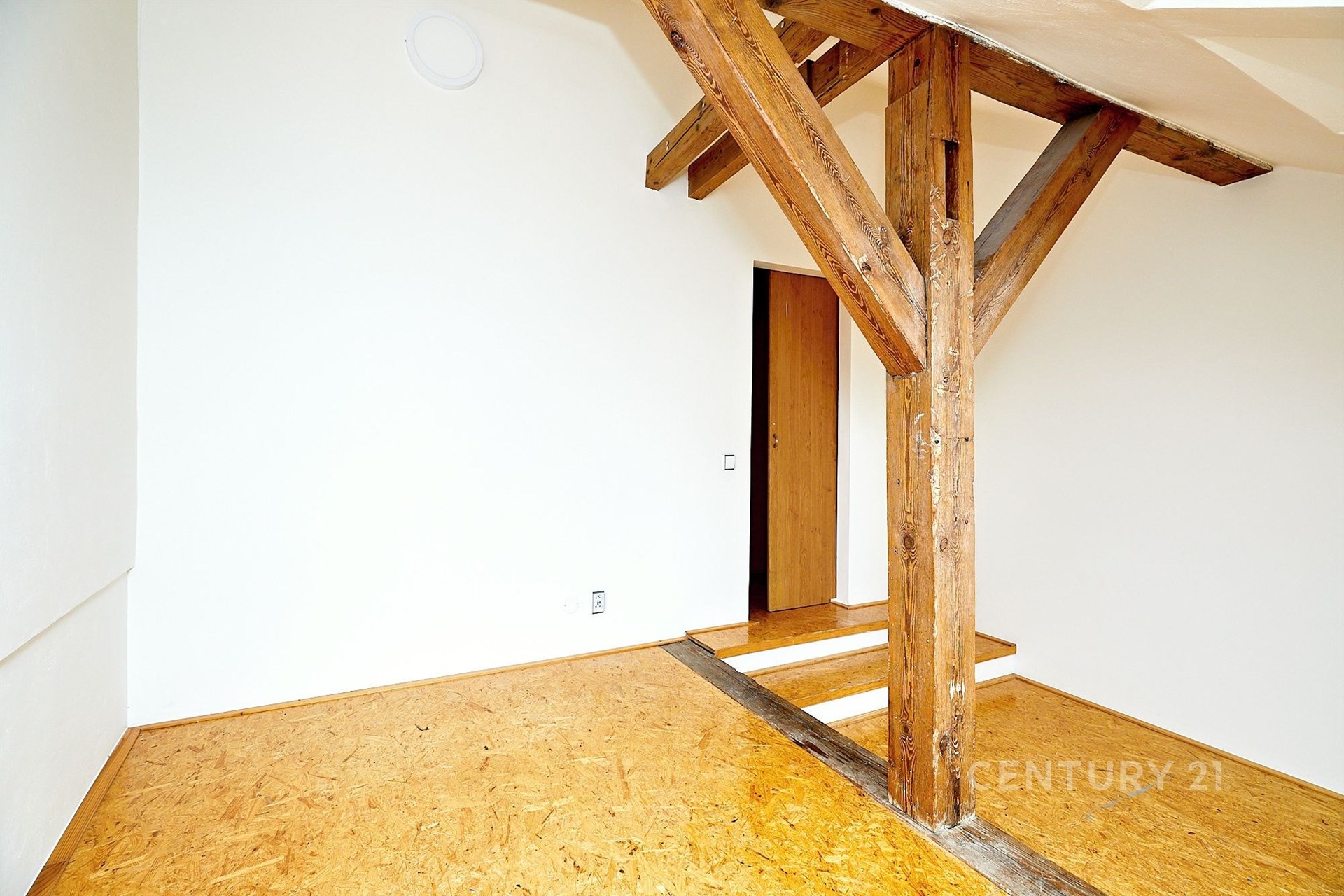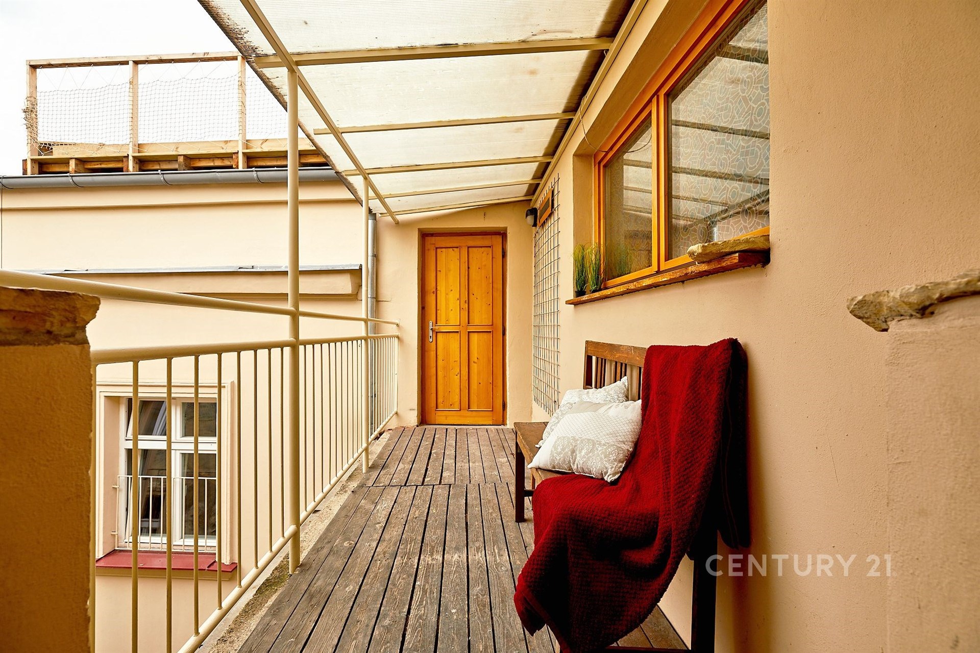 • Terasa (12 m²): Soukromá terasa s autentickým výhledem přímo přes hřebeny střech okolních domů. Je přístupná po úzkých schodech z předsíně a je nově částečně zastíněna (není na fotografii). V předsíni je dále samostatná komora.
