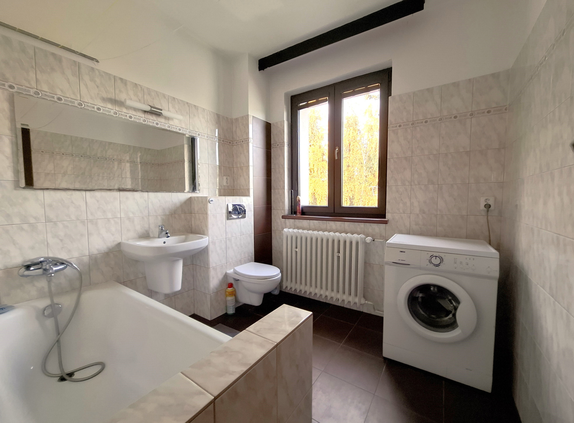 - Popis vybavení: kuchyňská linka, digestoř, sporák s troubou, lednice s mrazákem, pračka, vest. šatní skříně, nábytek viz foto
