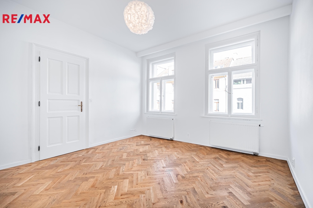 Útulný a světlý byt prošel nákladnou rekonstrukcí. Disponuje vstupní předsíní, prostorným obývacím pokojem s kuchyňskou linkou a dvěma pokoji, každý z nich má přitom svou vlastní koupelnou se sprchovým koutem. Kuchyně ve tvaru L je zařízena lednicí s mrazákem, indukční varnou deskou, elektrickým sporákem a myčkou, najdete v ní i prostor pro pračku. Na podlaze bytu jsou položeny renovované dřevěné parkety, vkusné vybavení a doplňky podtrhují stylový ráz bytu. Velkou výhodou je možnost parkování vozu ve dvoře domu (cena parkovacího stání činí 5.000,- Kč/1 vůz měsíčně).