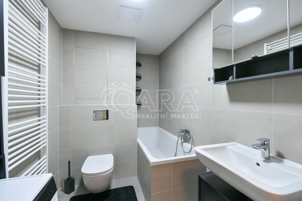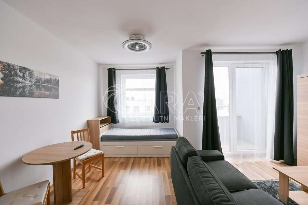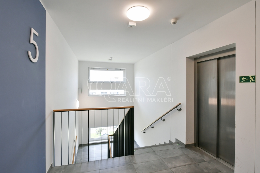 Byt o výměře 34,2 m2 (vnitřní plocha + sklep) s lodžií (2 m2) je umístěn v 5.NP novostavby bytového domu z roku 2020. Byt se pronajímá kompletně zařízen - vybaven kuchyňskou linkou s el. varnou deskou, troubou, lednicí, mikrovlnnou troubou. Dále je součástí pračka, jídelní stůl, 2x židle, sedací souprava, konferenční stolek, rozkládací postel a šatní skříň s věšákem v předsíni. Koupelna je společná s WC. V bytě je položena plovoucí podlaha, v koupelně a v chodbě je dlažba. Orientace oken na východ. K bytu patří sklepní kóje v suterénu domu a venkovní parkovací stání. Vytápění zajišťuje centrální plynová kotelna v domě. Nízké měsíční poplatky 2.650,- Kč + elektřina převodem. Kauce ve výši jednoho nájmu, provize ve výši jednoho nájmu. Kuřáci a domácí mazlíčci nejsou vítáni.